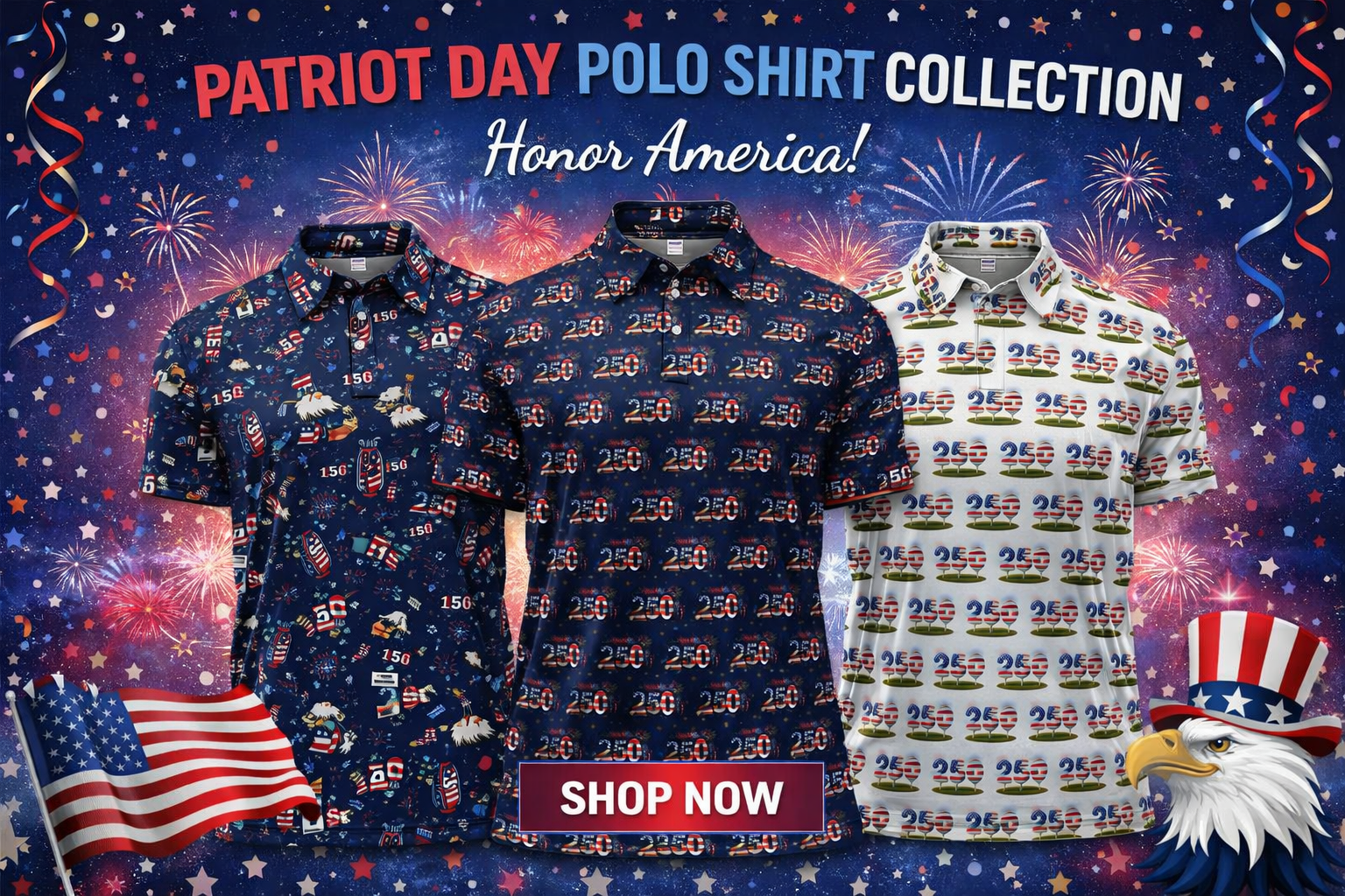 250 USA Birthday Pattern Golf Polos, Patriotic Bald Eagle American Flag Shirt, Crazy Golf Shirt For Men