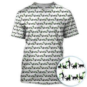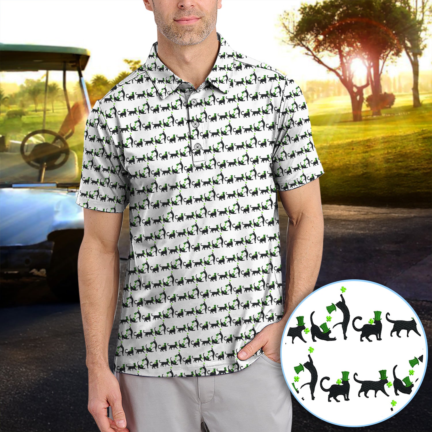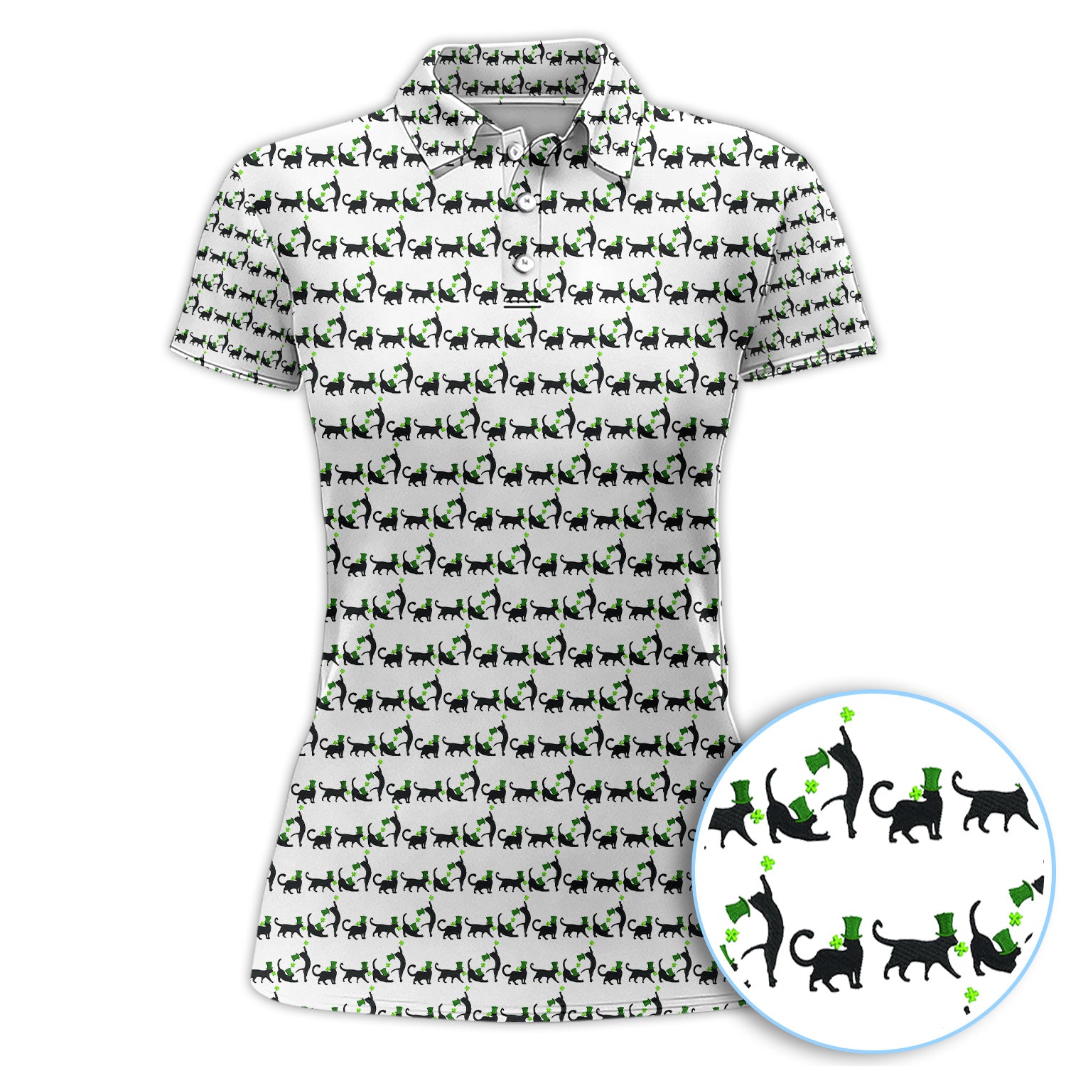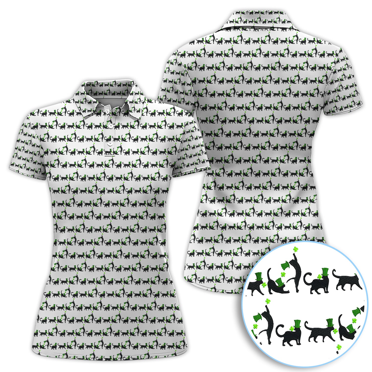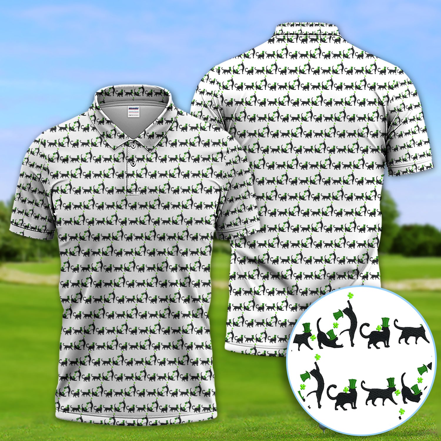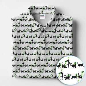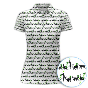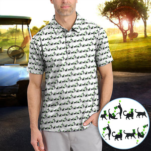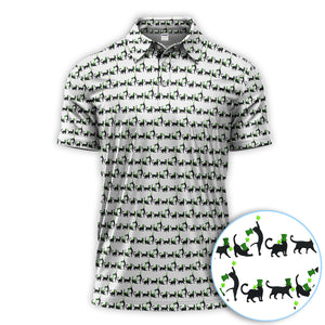 Black Cat St Patrick’s Day Golf Polos, Lucky Cat Pattern Golf Shirt, Golf Gift For Golfer