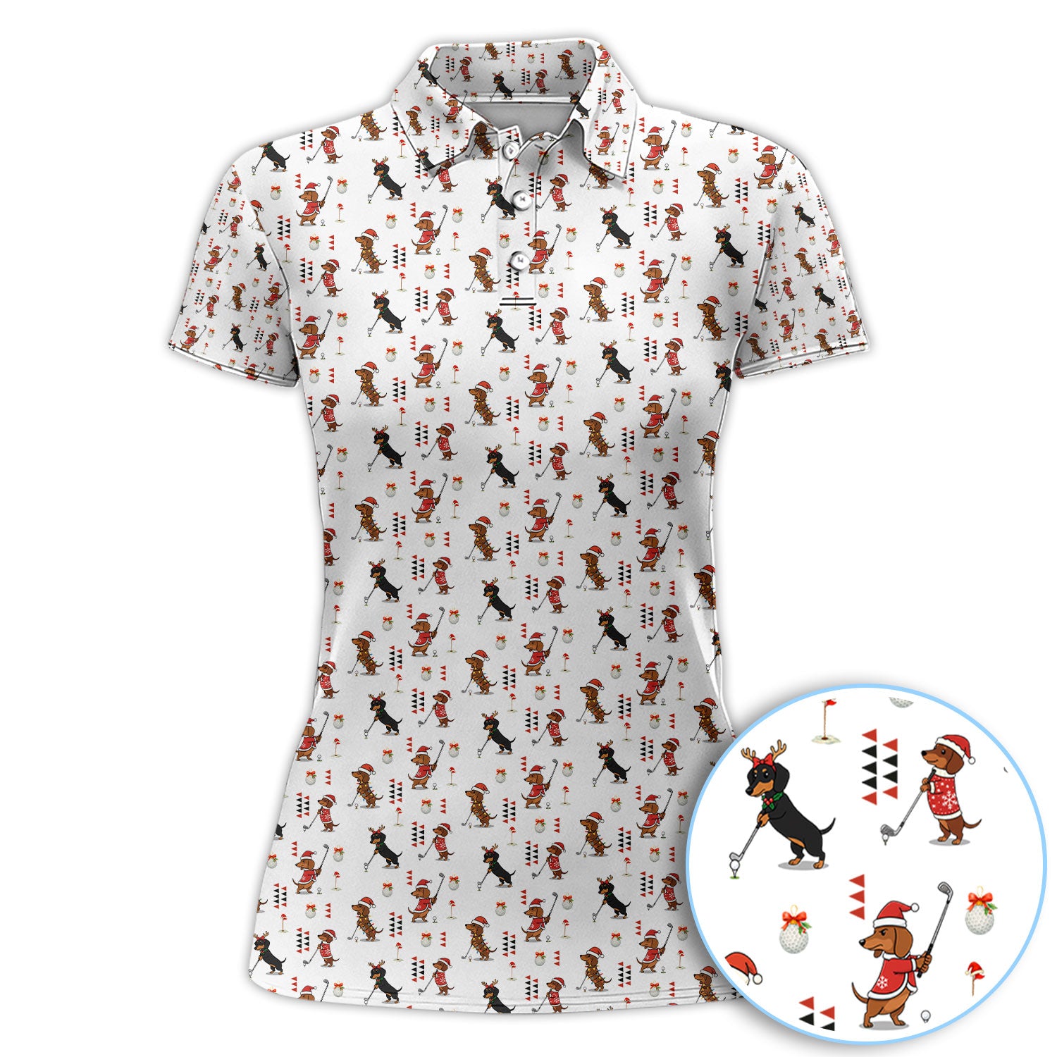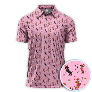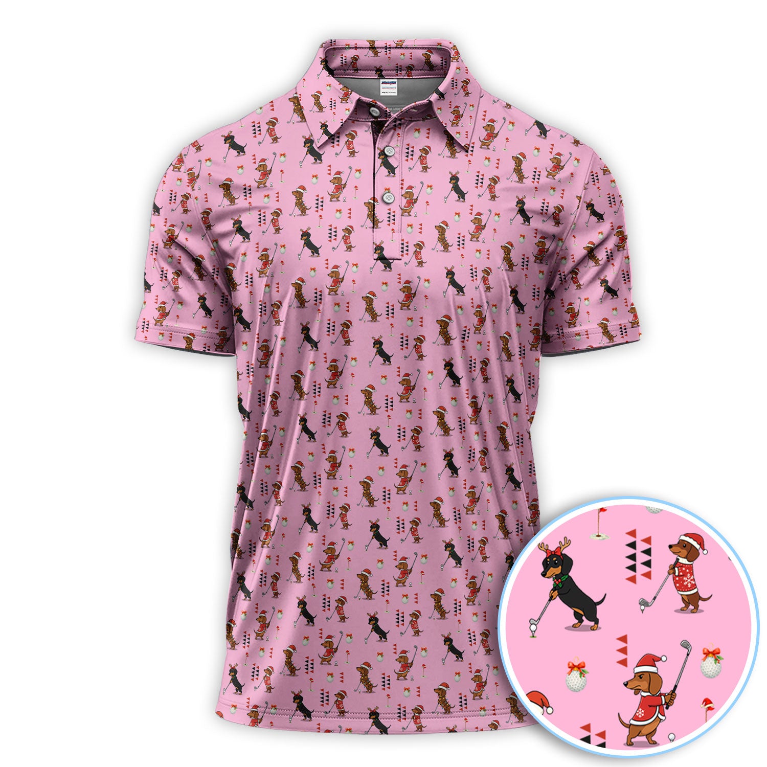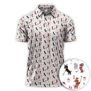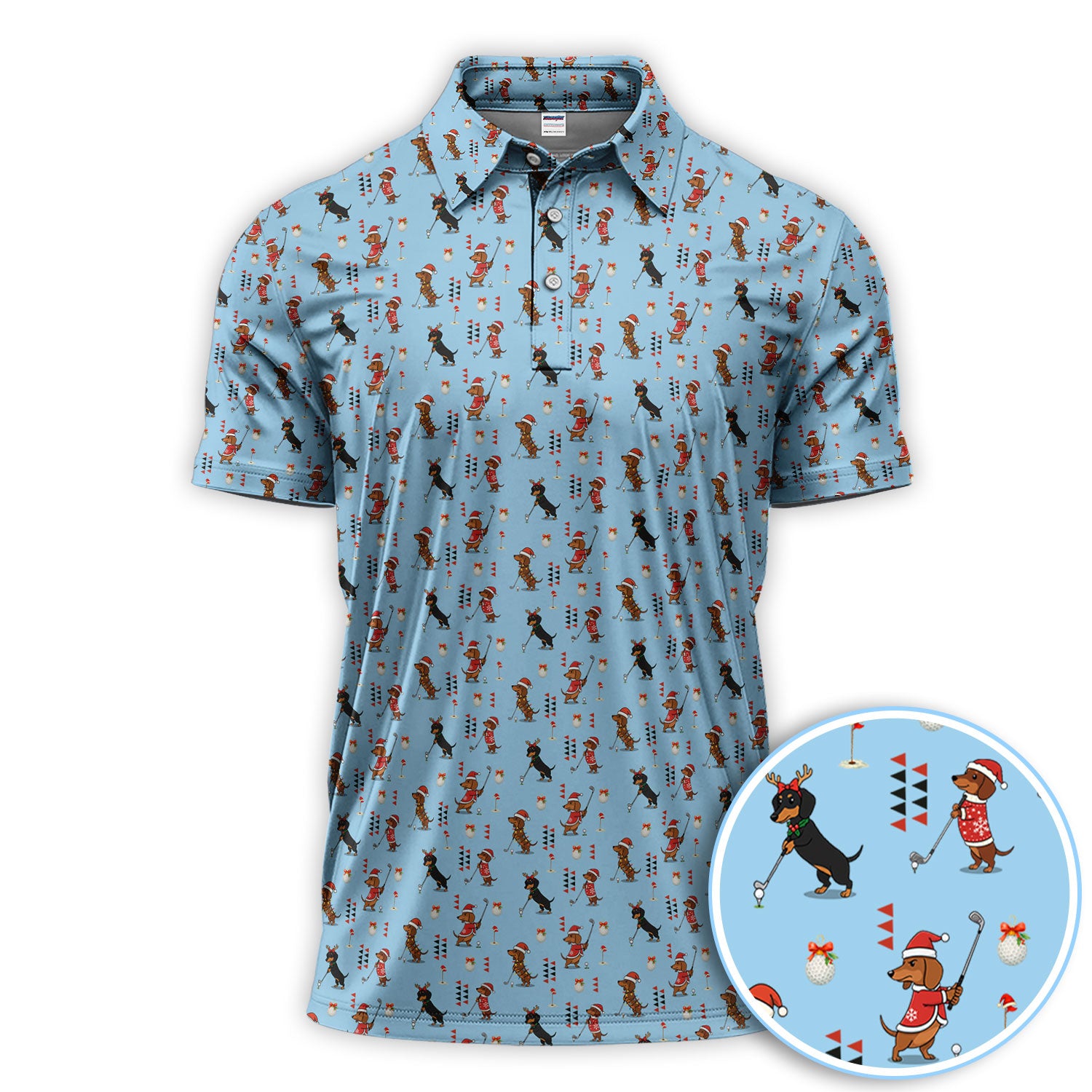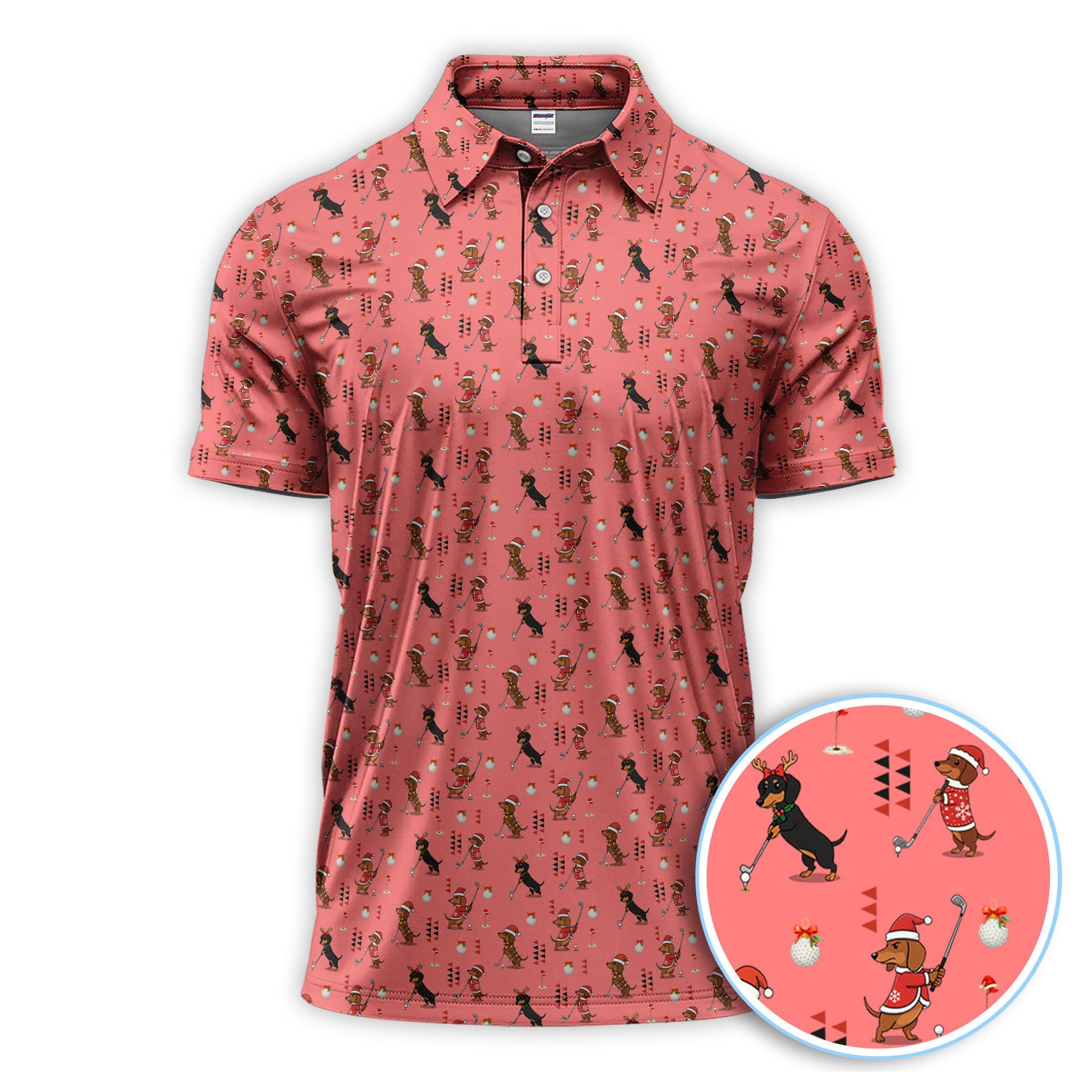 Christmas Dachshund Pattern Polos, Funny Xmas Wiener Dog Golf Shirt, Festive Golf Gift For Men