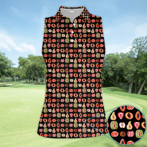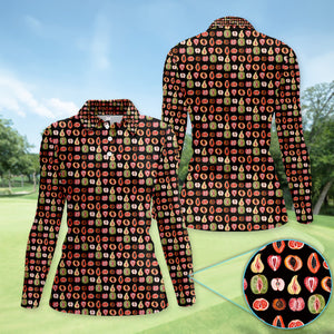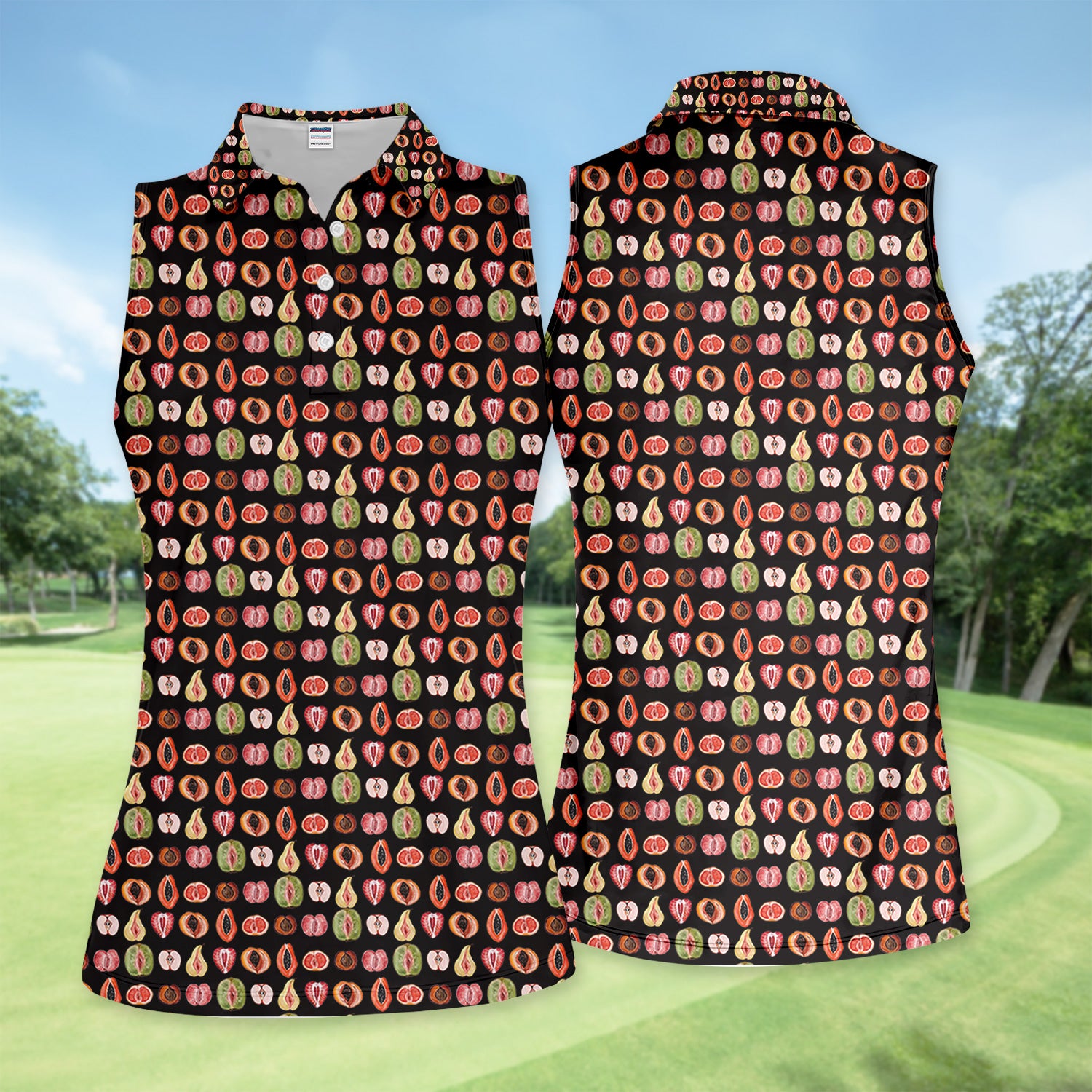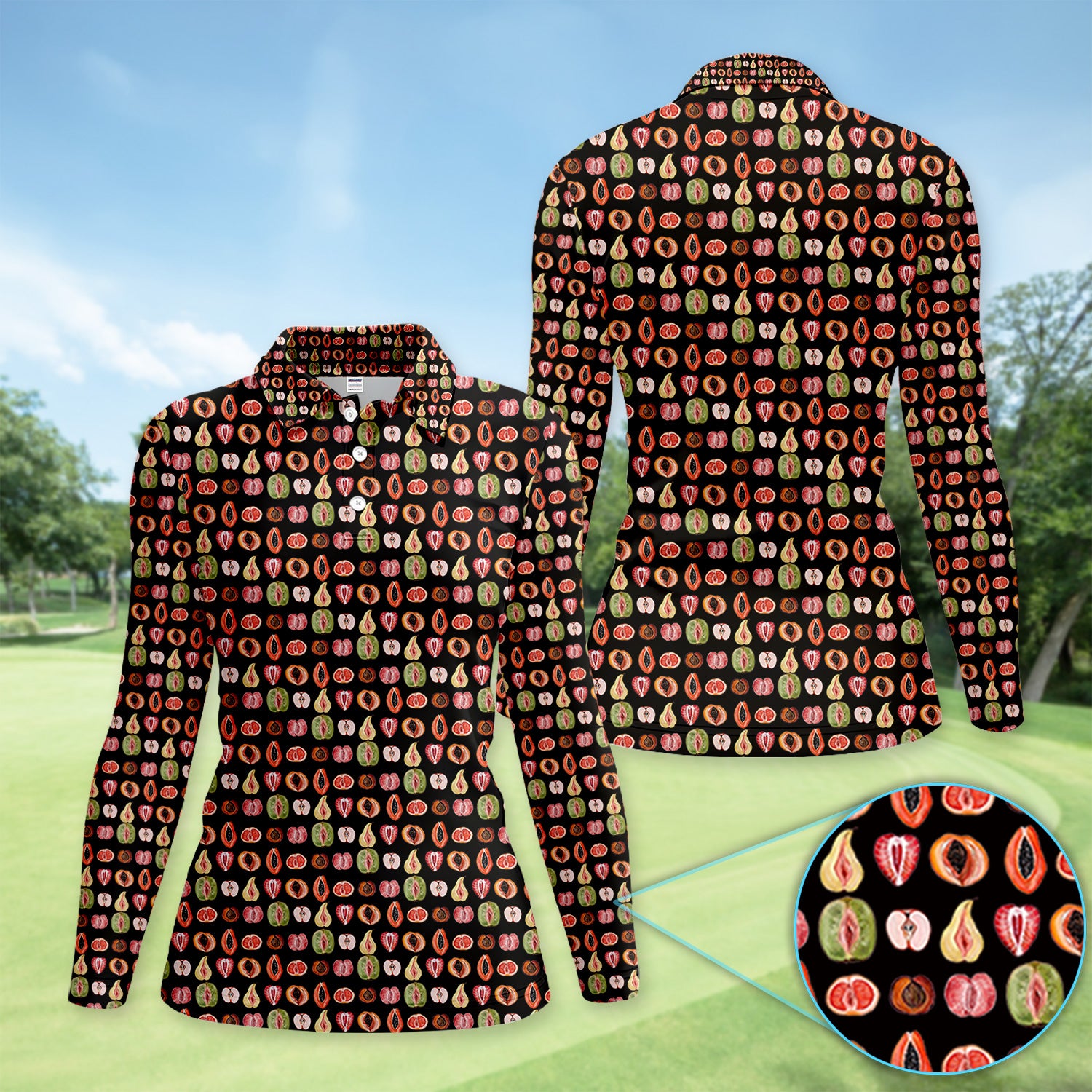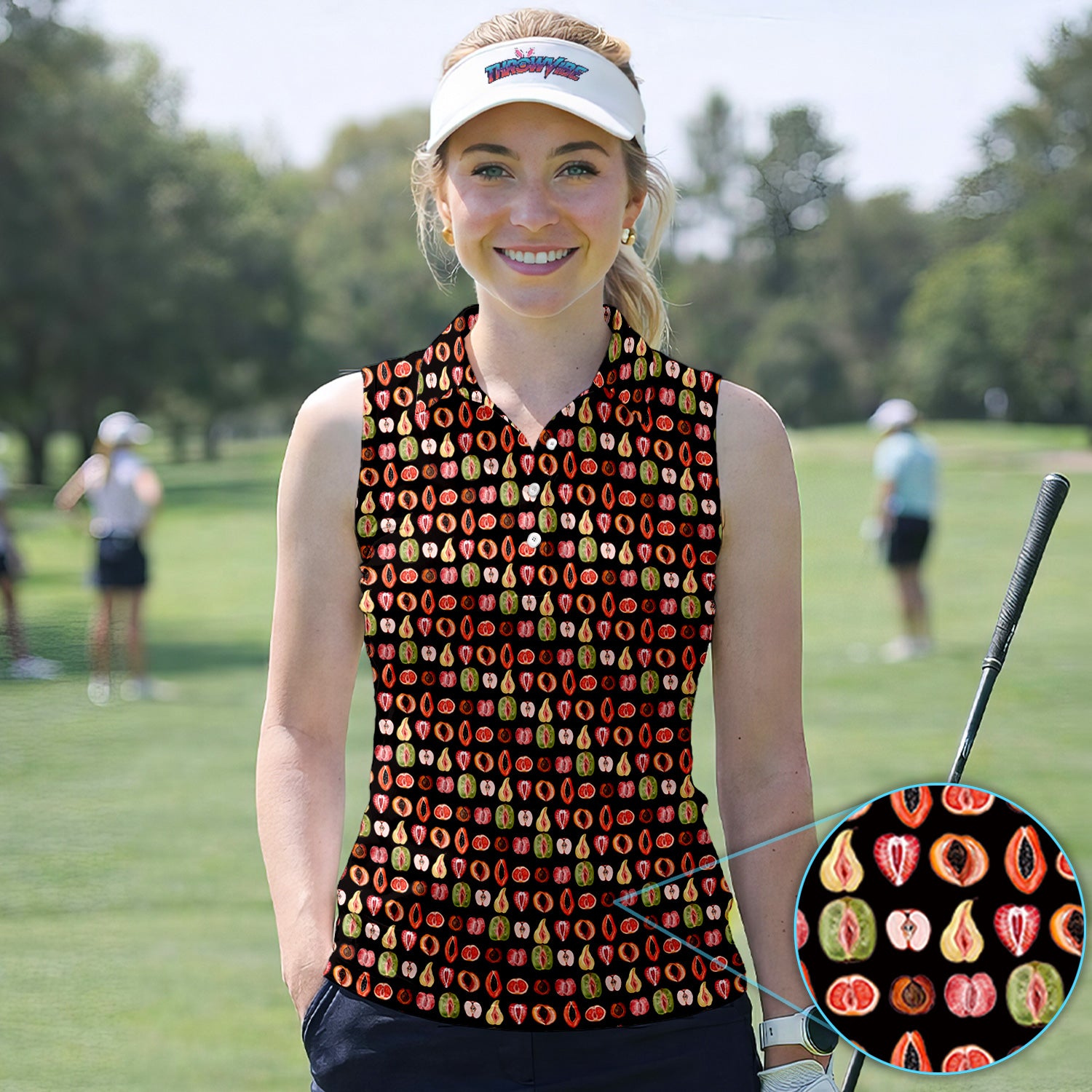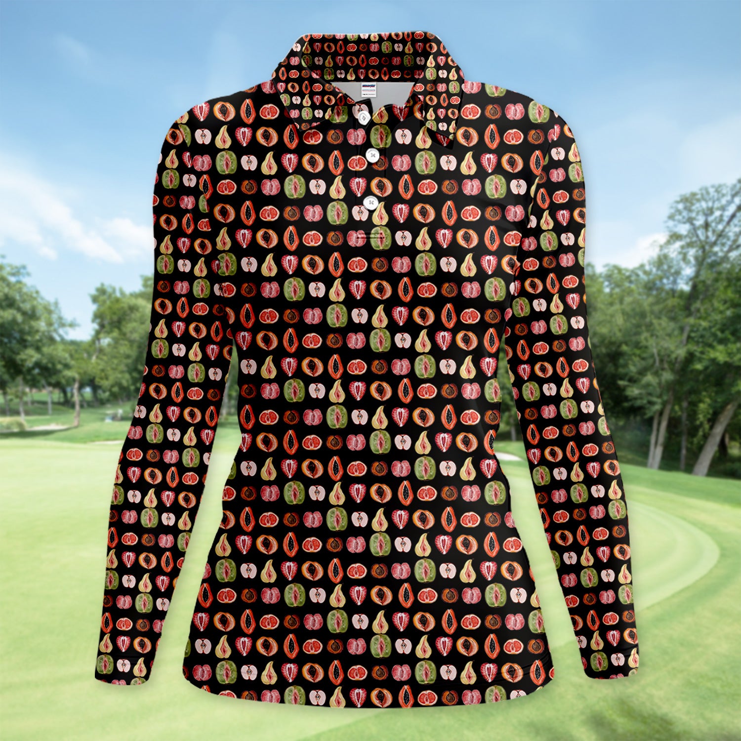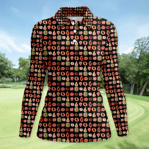 Colorful Fruit Pattern Polo Shirt, Black Background Summer Fruit Shirt, Vibrant Tropical Food Print Golf Polo For Women