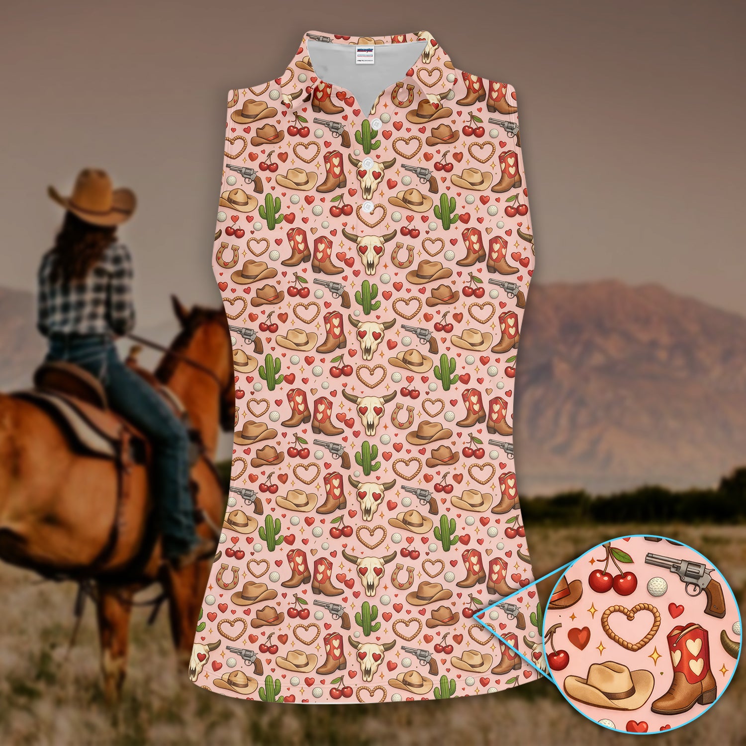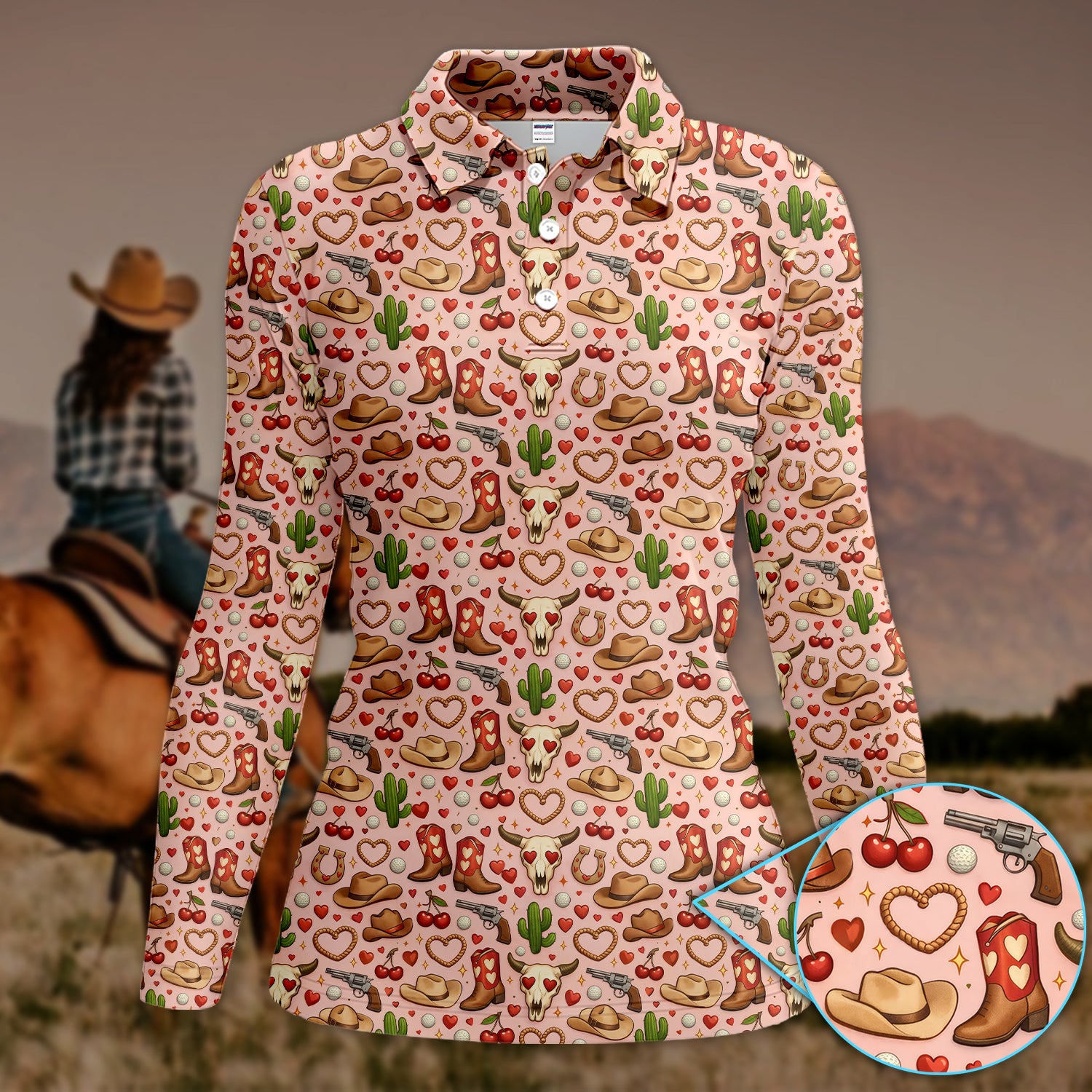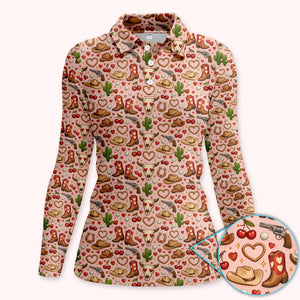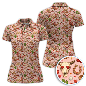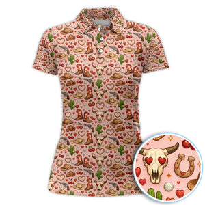 Cowgirl Heart Skull Golf Shirt For Women, Country Boots Cactus Pattern Golf Polos, Golf Gift For Golfer