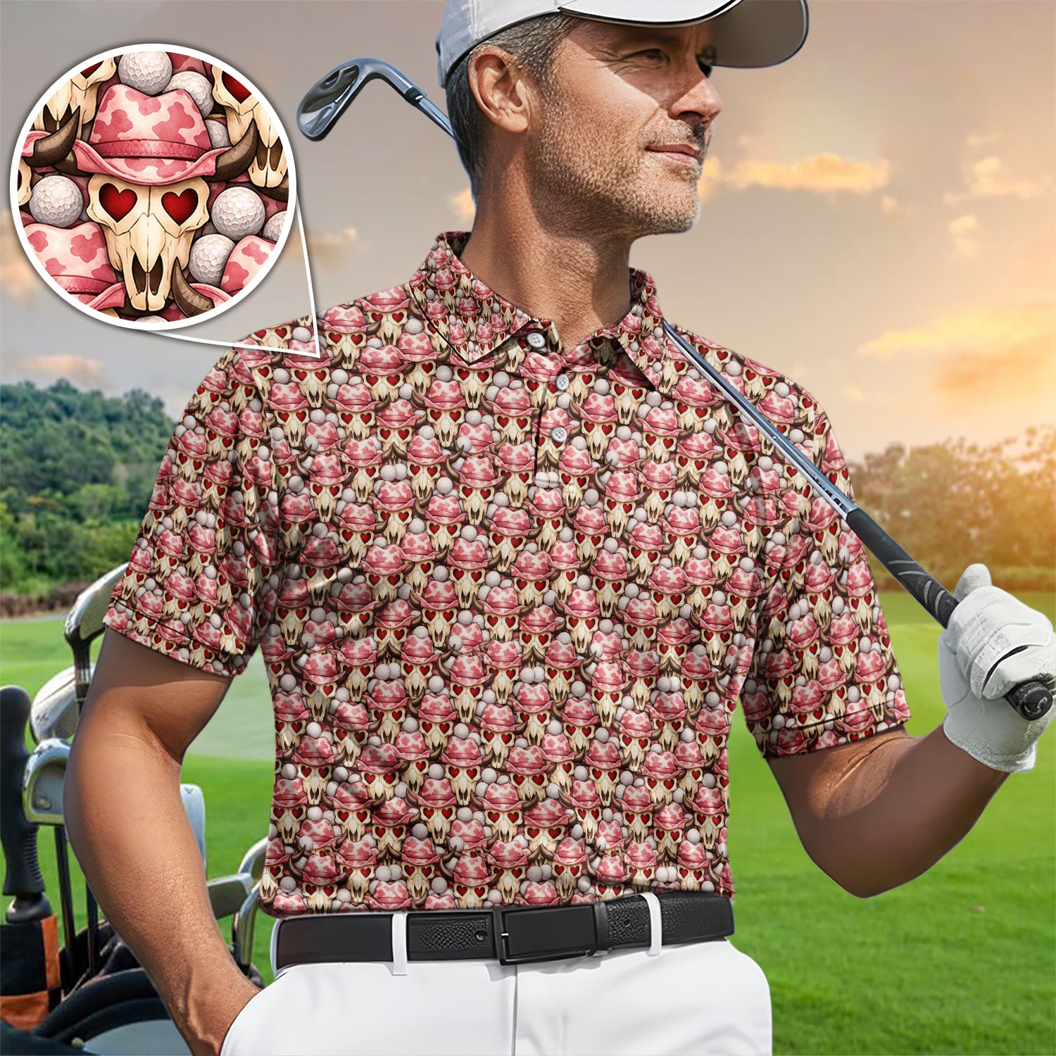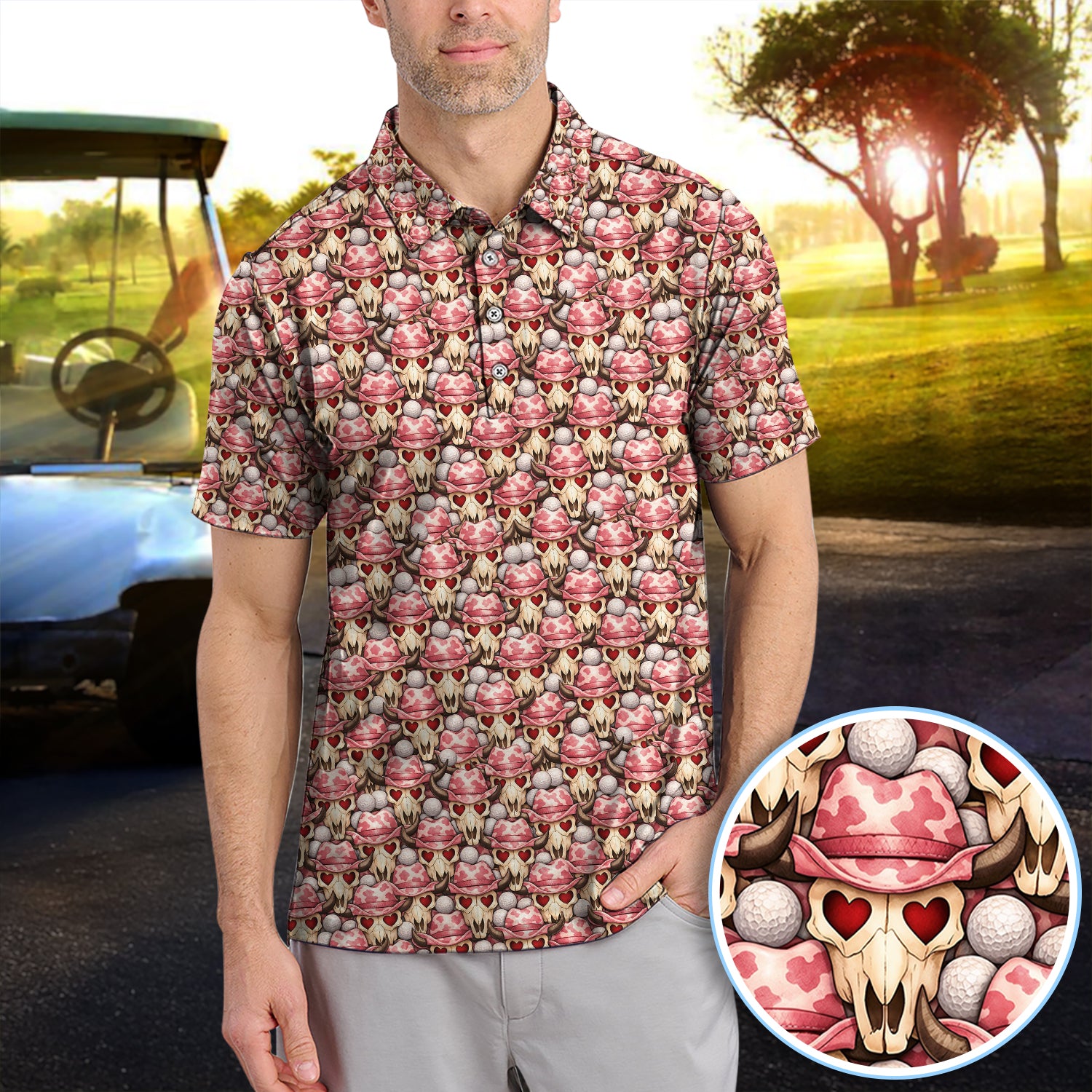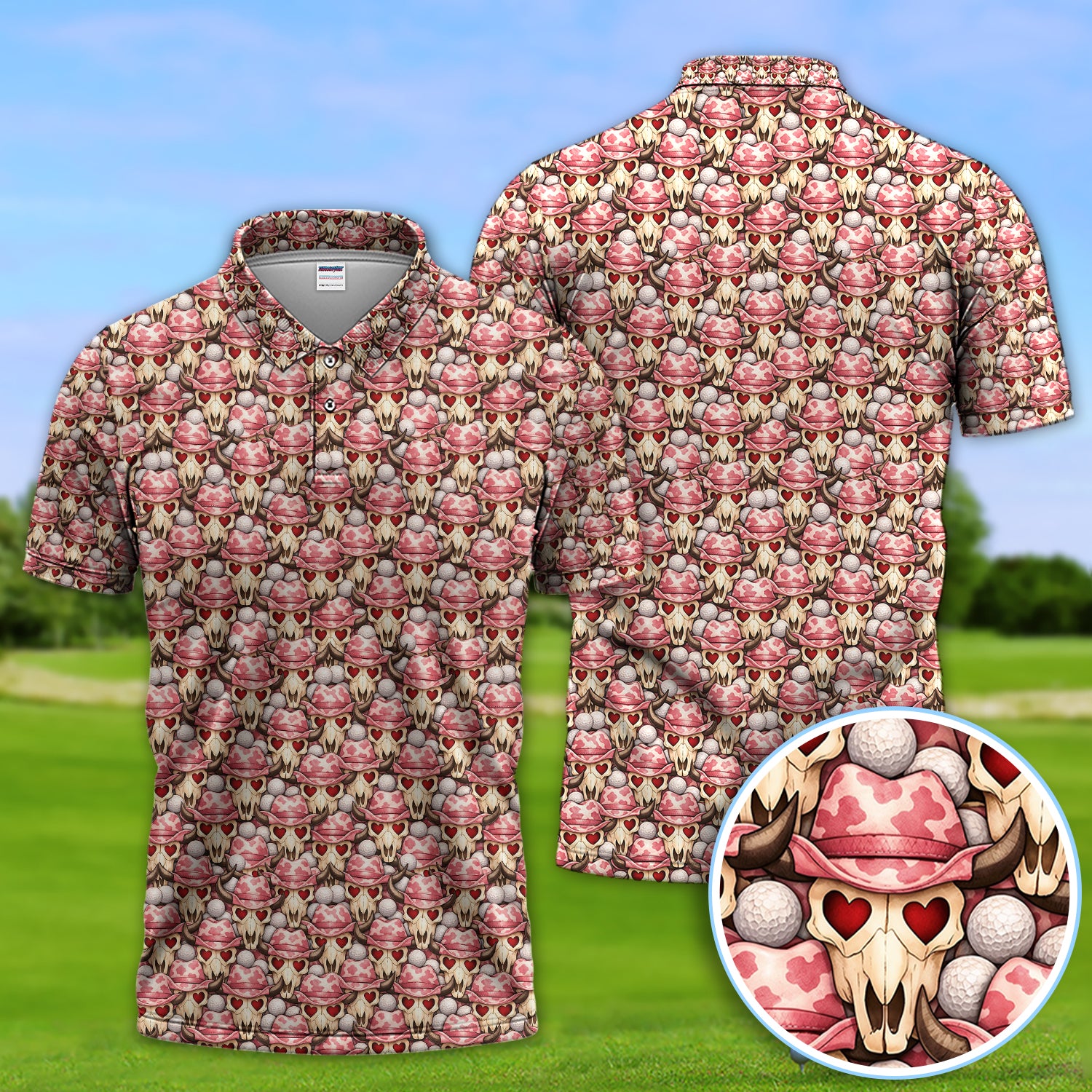 Cowboy Loves Golf Shirt, Pink Western Skull Heart Pattern Golf Polos For Men, Fun Golf Gift For Golfer