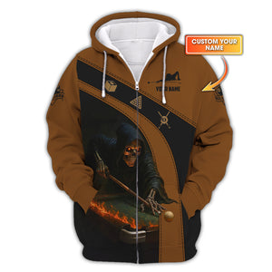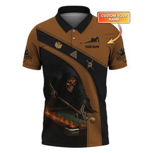 Billiards T Shirt Grim Reaper Pool Player Tee Custom Black Brown Flaming Table Design