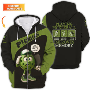 Custom Funny Pickleball T Shirt Green, Pickle Ball Charactor, Playing Pickleball Improves Memory, Pickleball Gift for Players