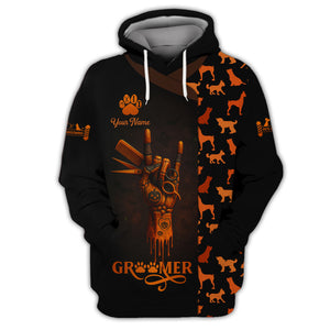 Custom Name Halloween Groomer Shirt, Dog Grooming Uniform with Skeleton Hand and Pet Silhouette Pattern