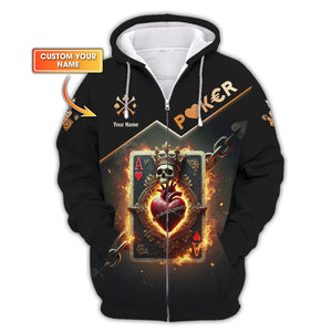 Custom Poker T-Shirts – Fiery Ace of Hearts, Skull Crown and Chains, Gift For Poker Players