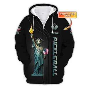 Custom USA Pickleball Shirt – Statue of Liberty Design with Paddle & Ball – Patriotic Pickleball Apparel for Men & Women