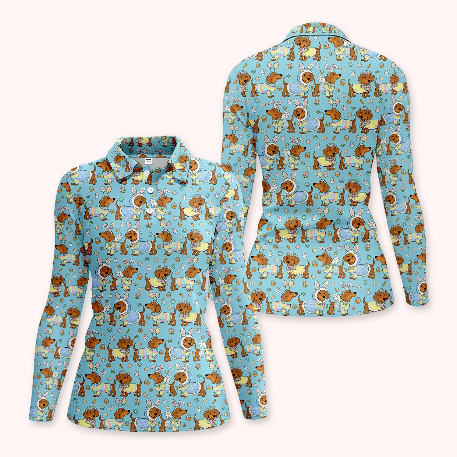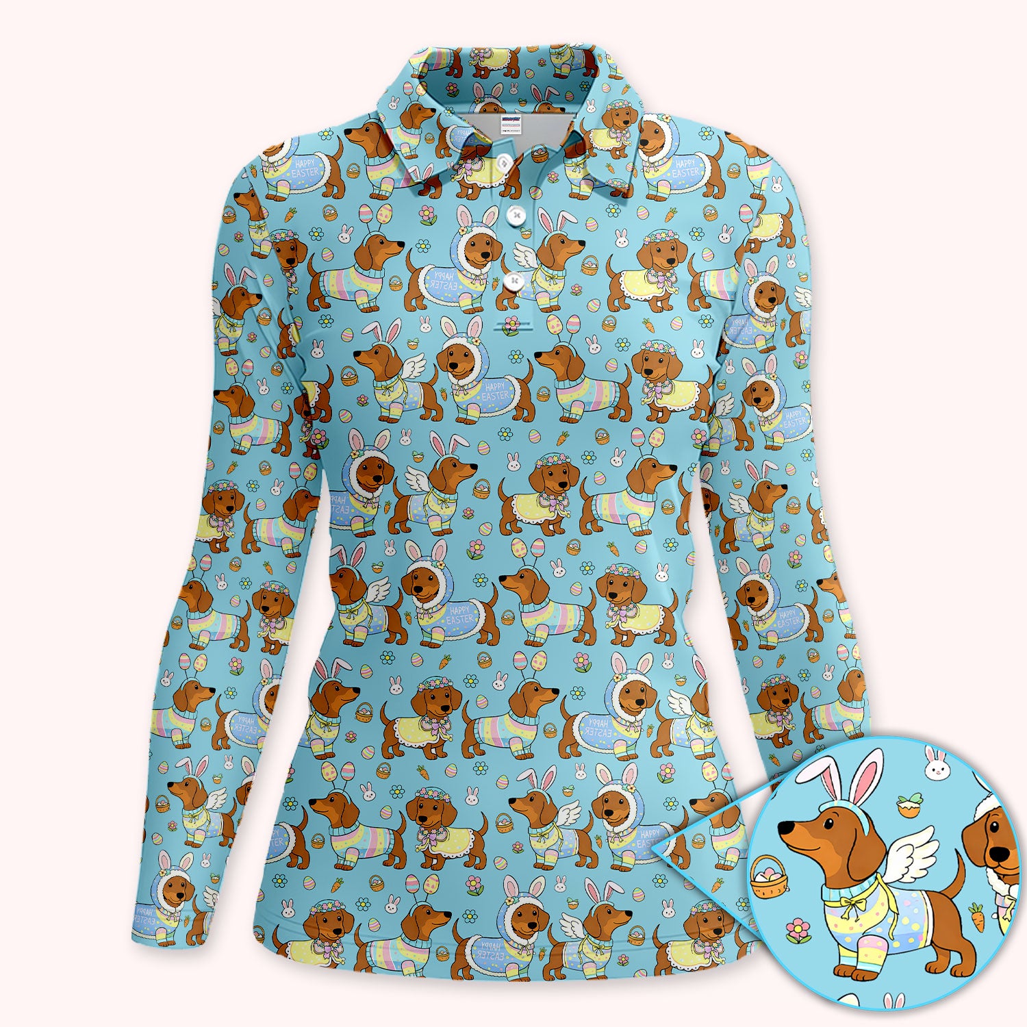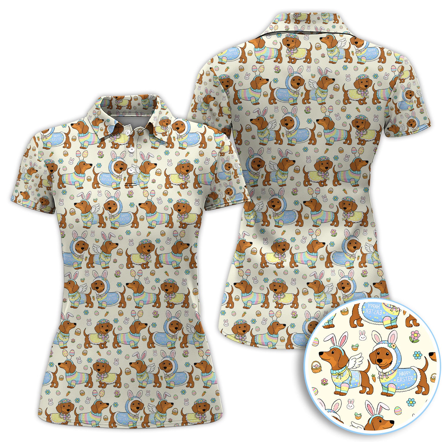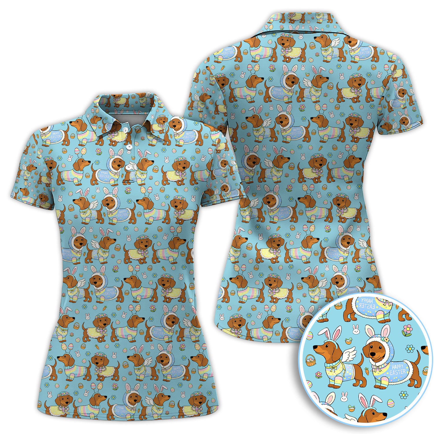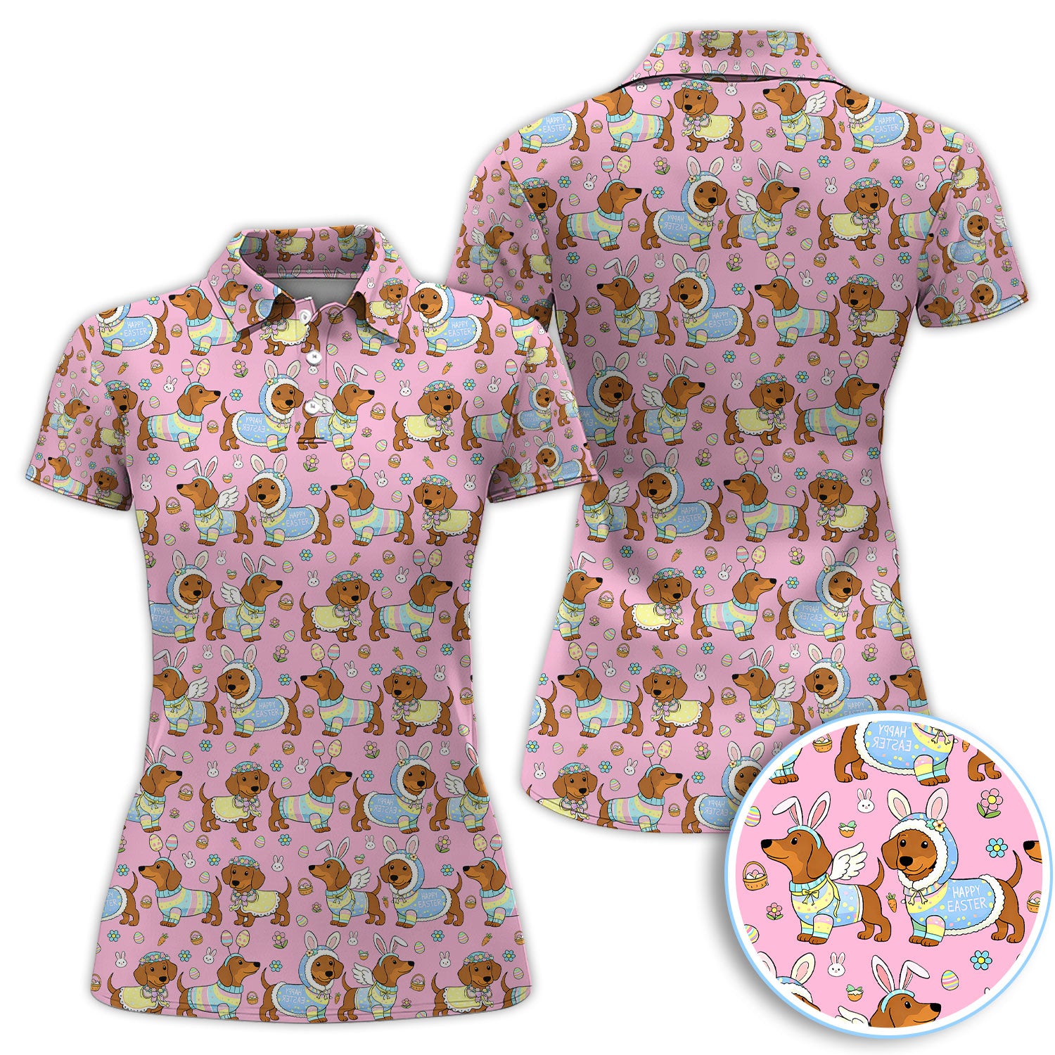 Dachshund Happy Easter Golf Polos, Easter Wiener Dog Pattern Golf Shirt, Golf Gift For Women