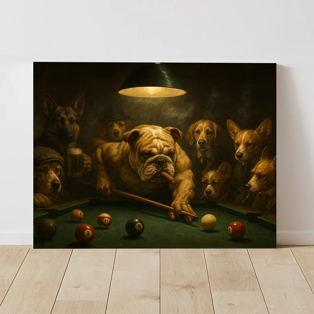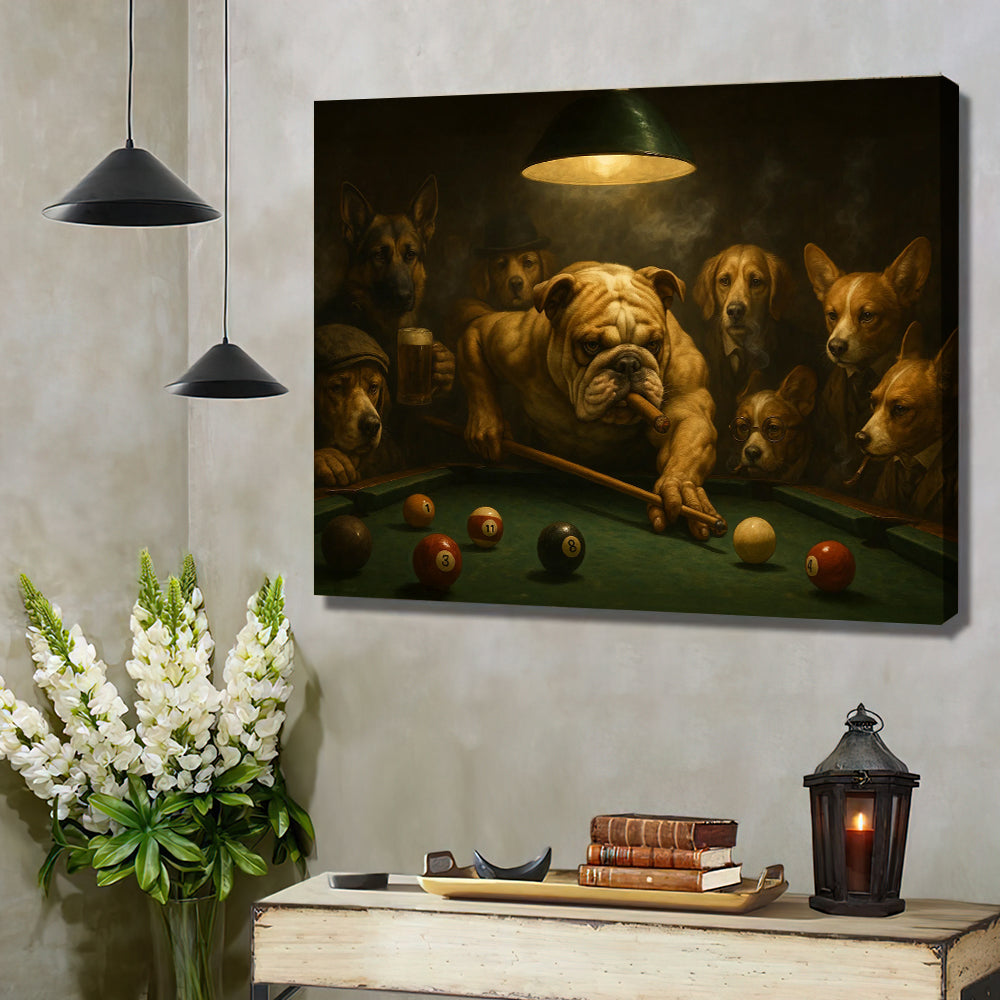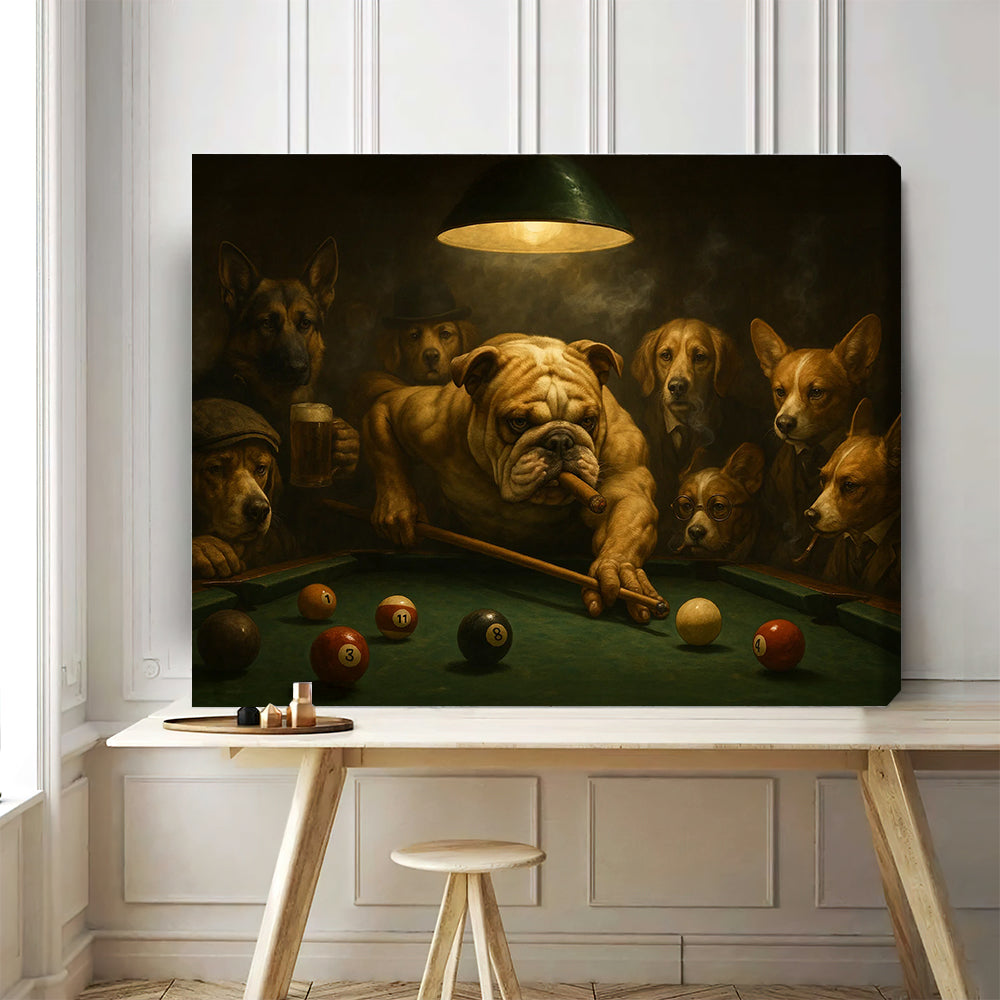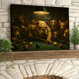 Dog Playing Pool Wall Art, Funny Bulldog Billiards Poster, Vintage Billiards Canvas For Game Room