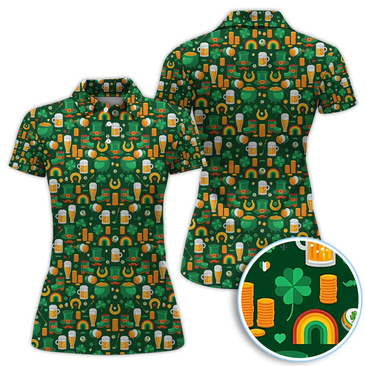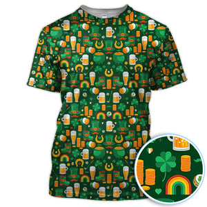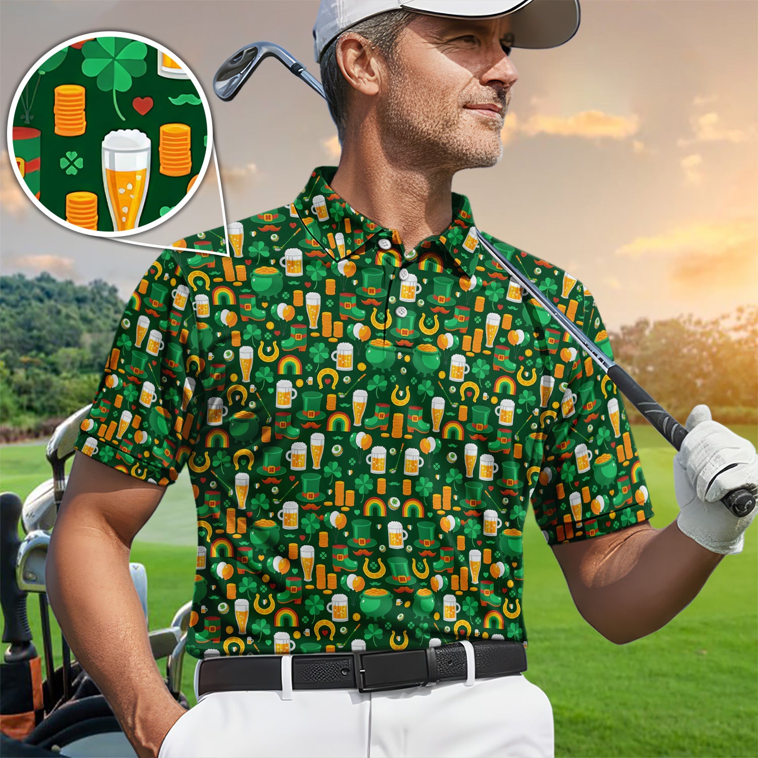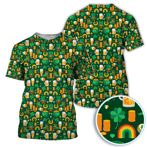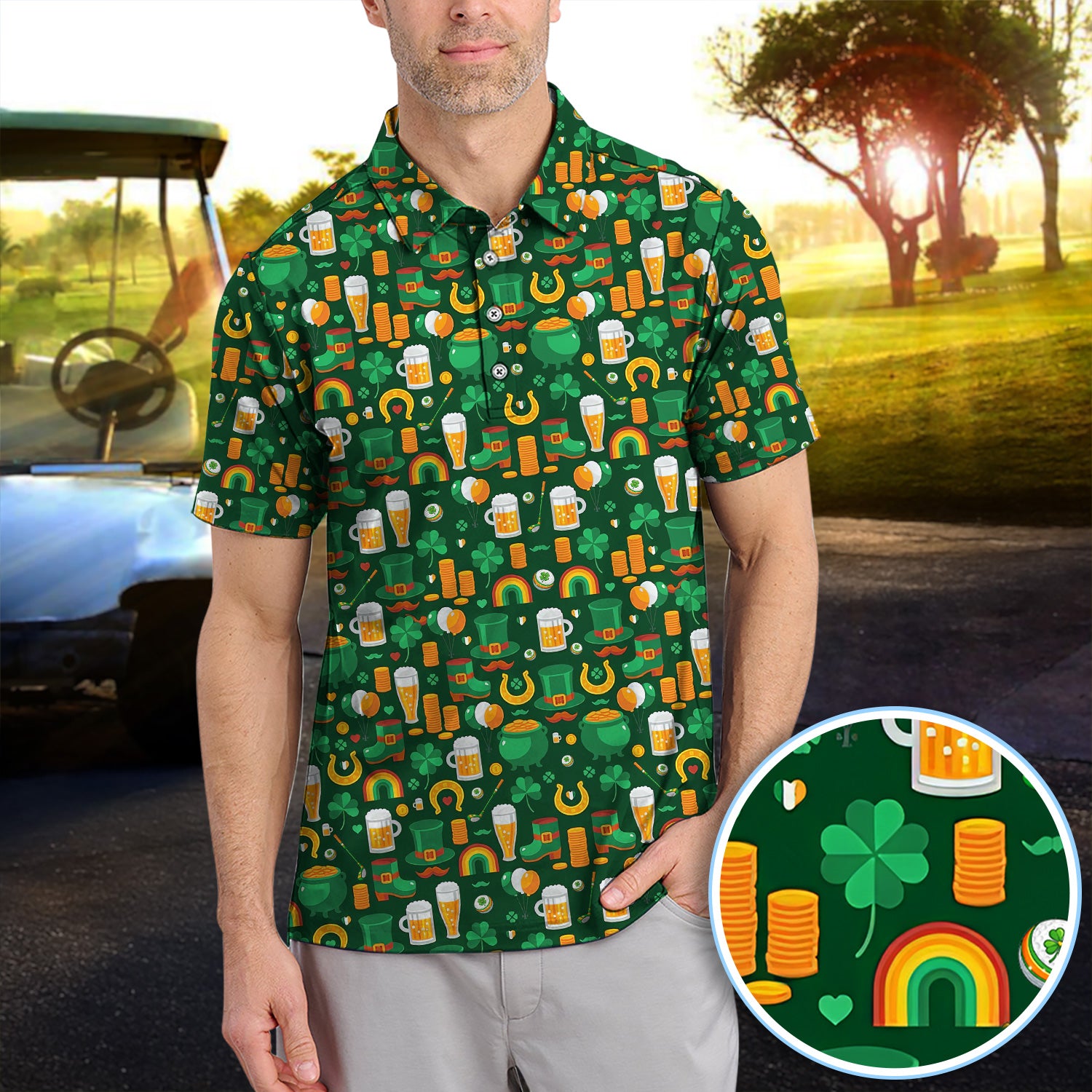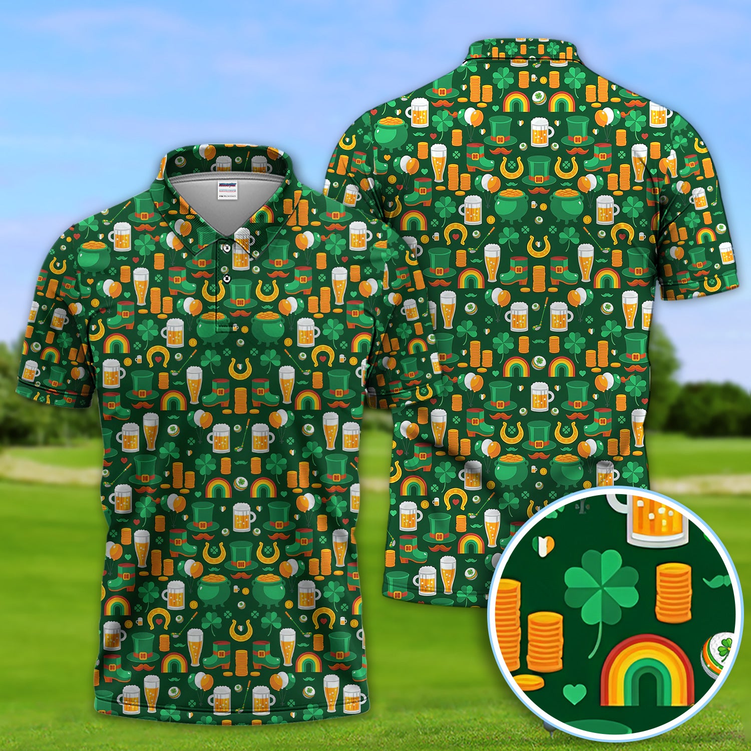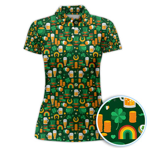 Funny St. Patrick’s Day Pattern Golf Polos, Irish Shamrock And Beer Golf Shirt For Men, Crazy Golf Gift For Golfer