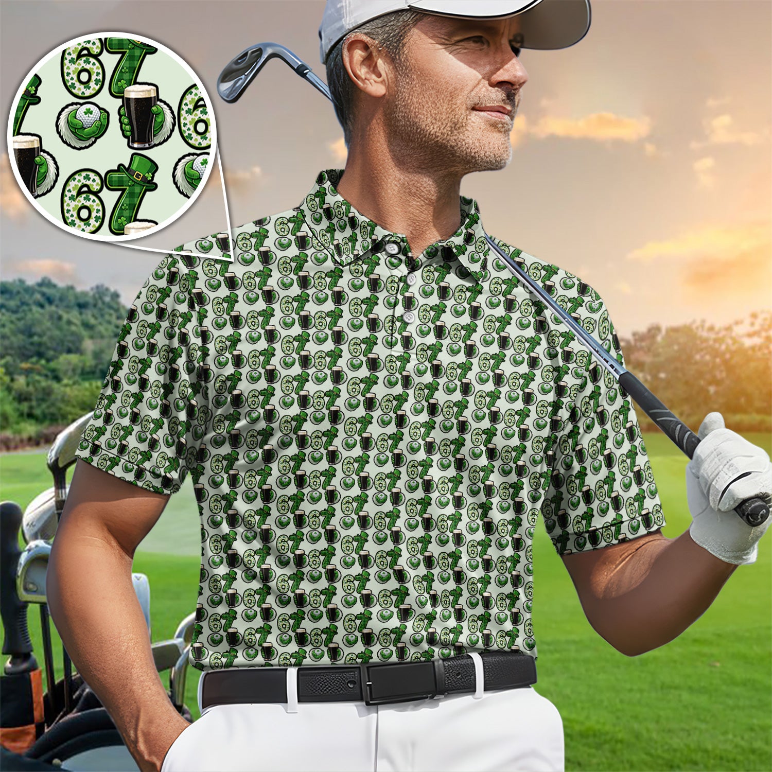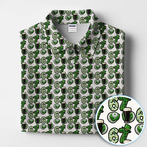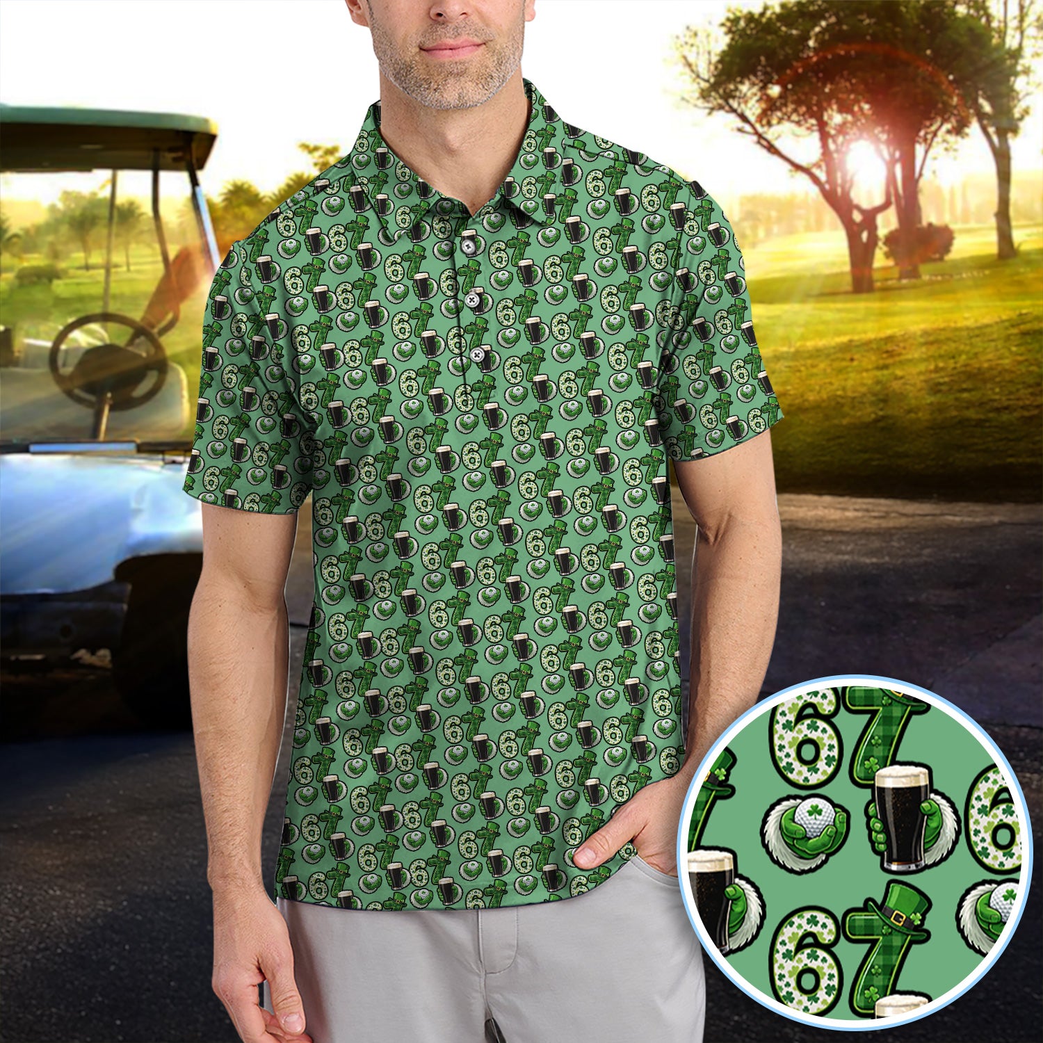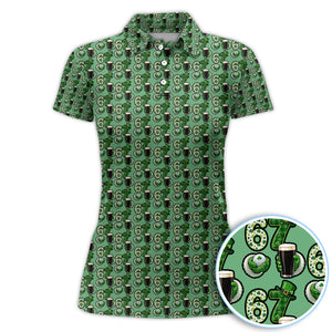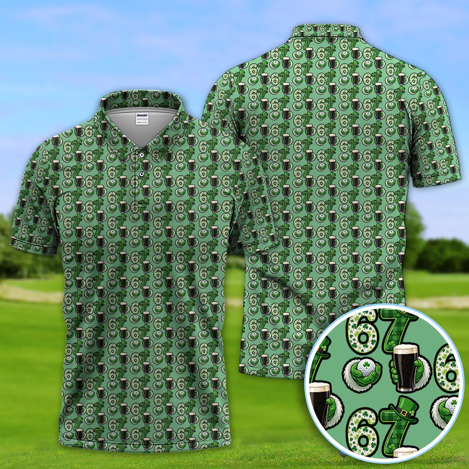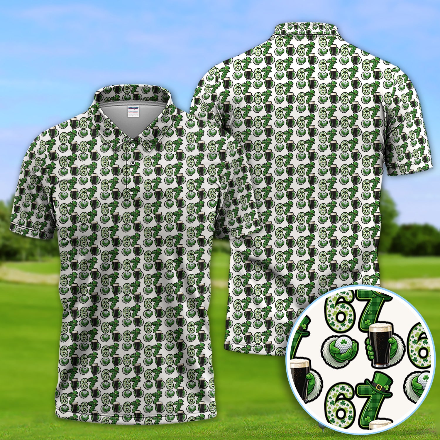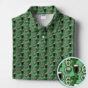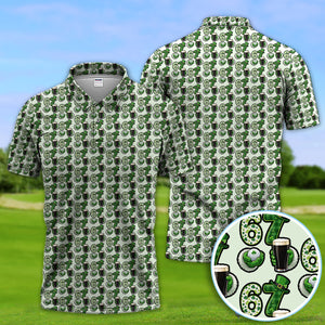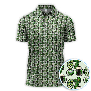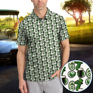 Men’s St. Patrick’s Day Golf Polos, 67 Shamrock Beer Pattern Golf Shirt, Crazy Golf Gift For Golfer