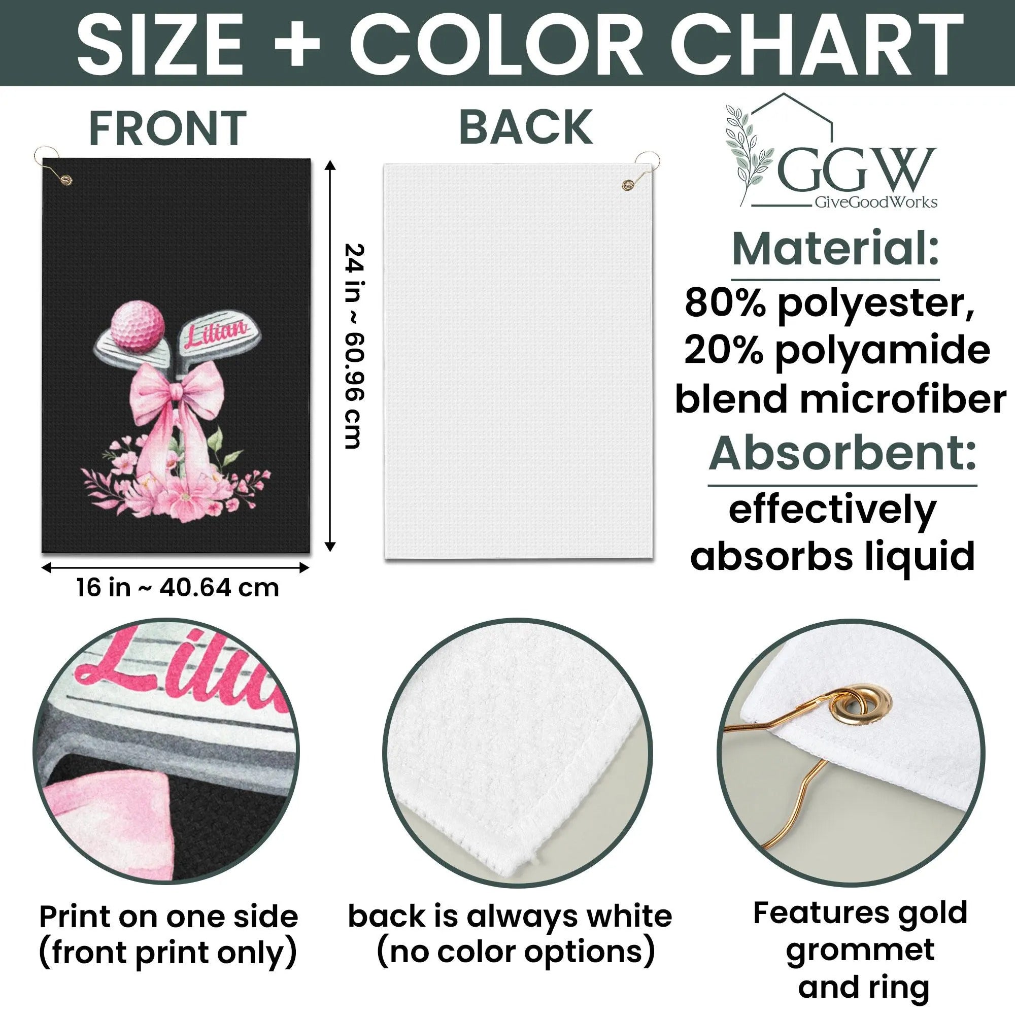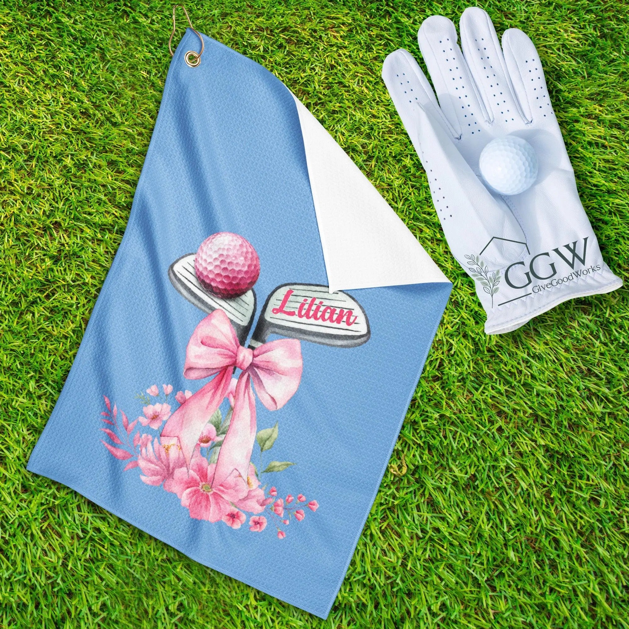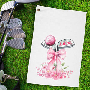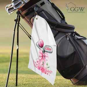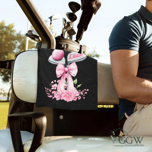 Personalized Name Golf Towel Pink Floral Bow Design With Golf Clubs, Custom Golf Towels For Women, Gift For Golfers