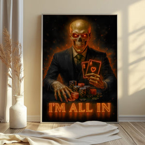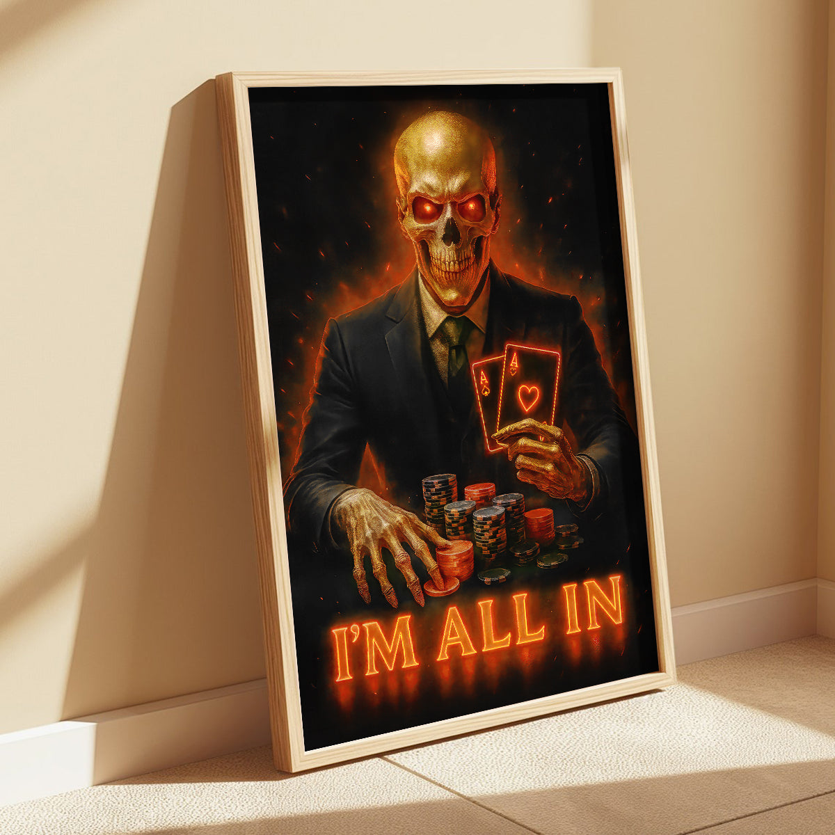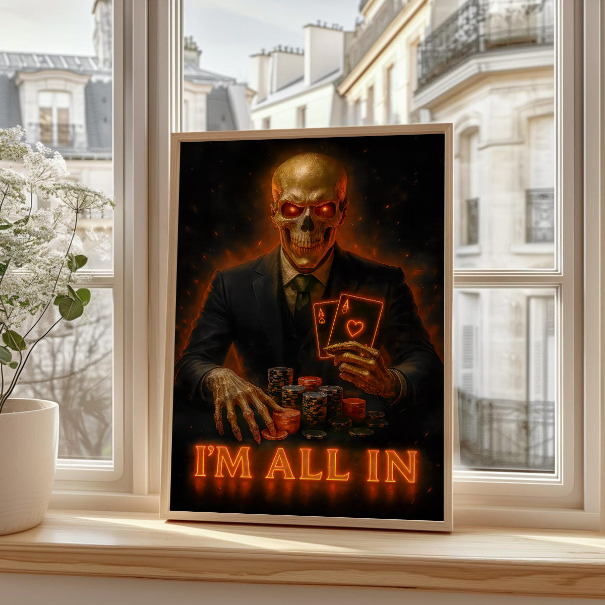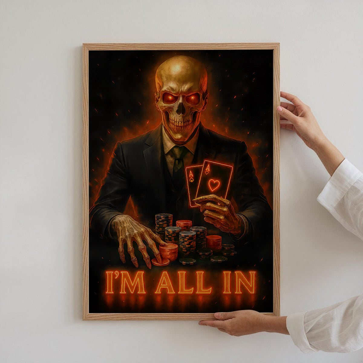 Poker Poster, Skull Player With Cards And Chips, I'm All In Wall Art, Poker Players Bar Or Game Room Decor