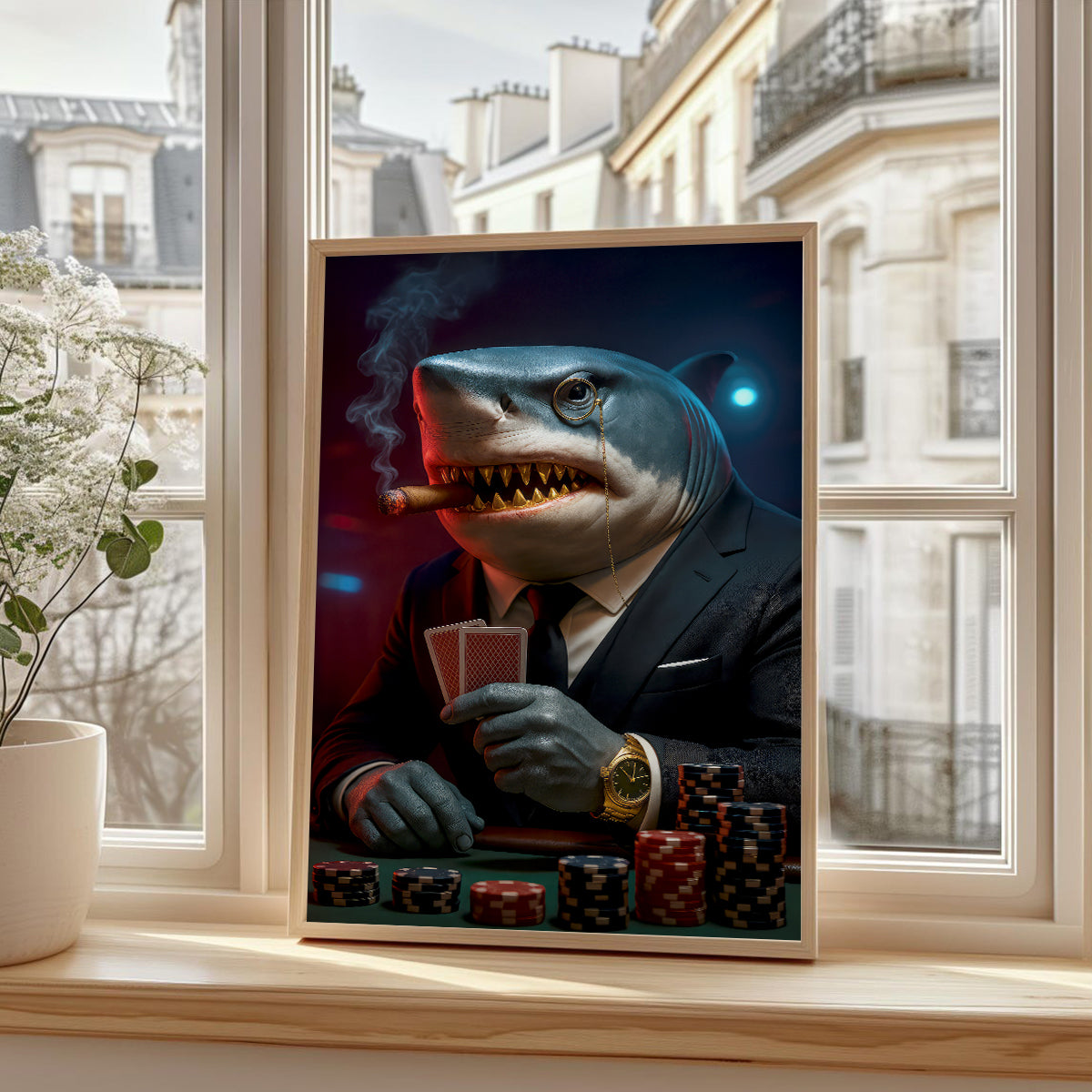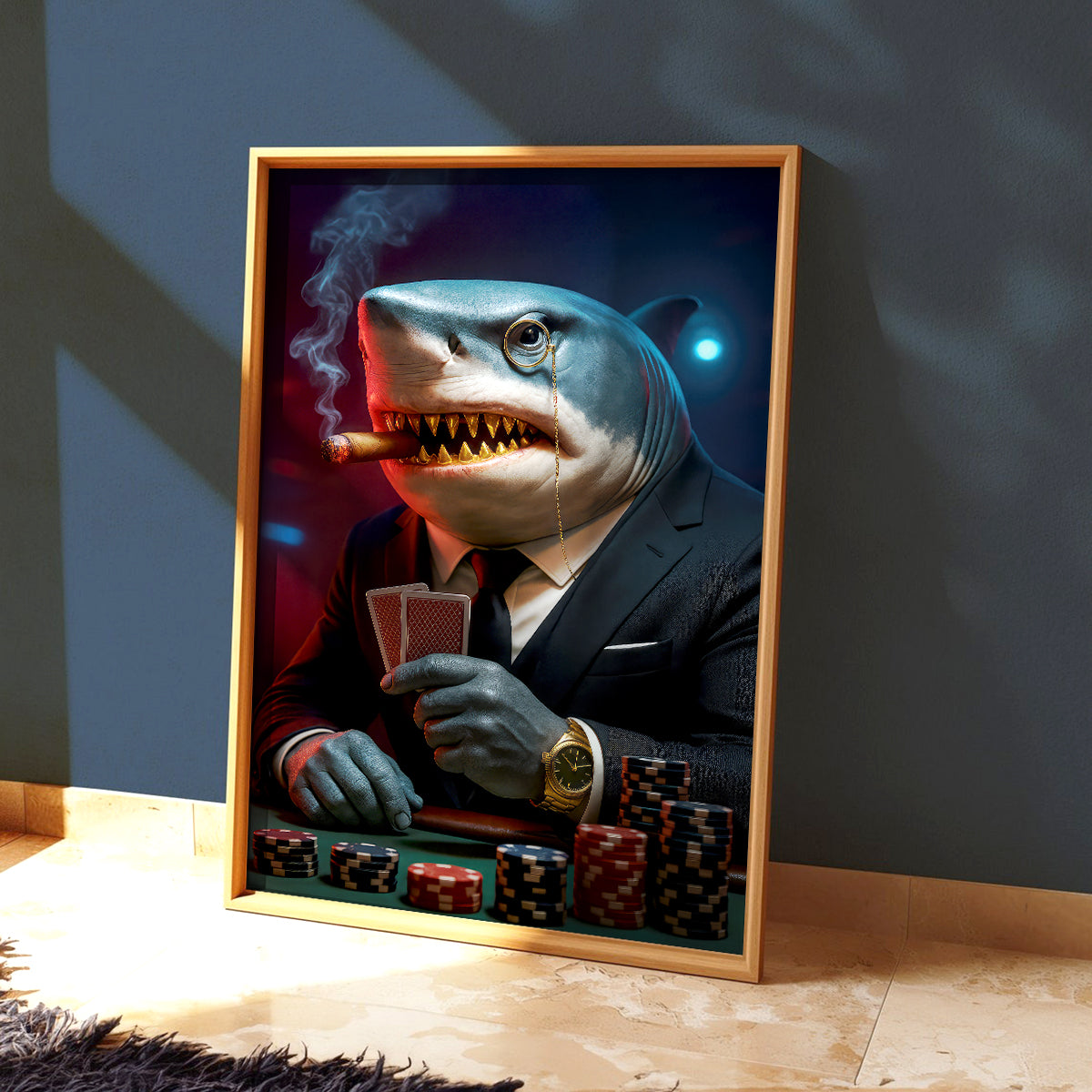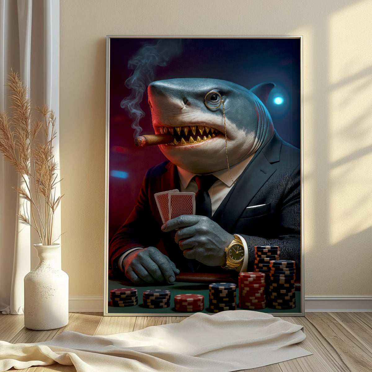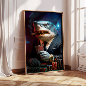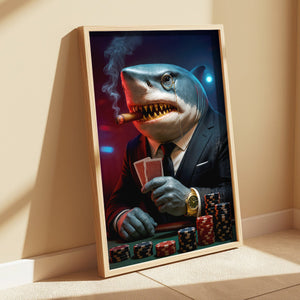 Poker Shark With Card And Chip Poster, Poker Canvas Wall Art, Poker Poster For Game Room Decor, Gift For Poker Players