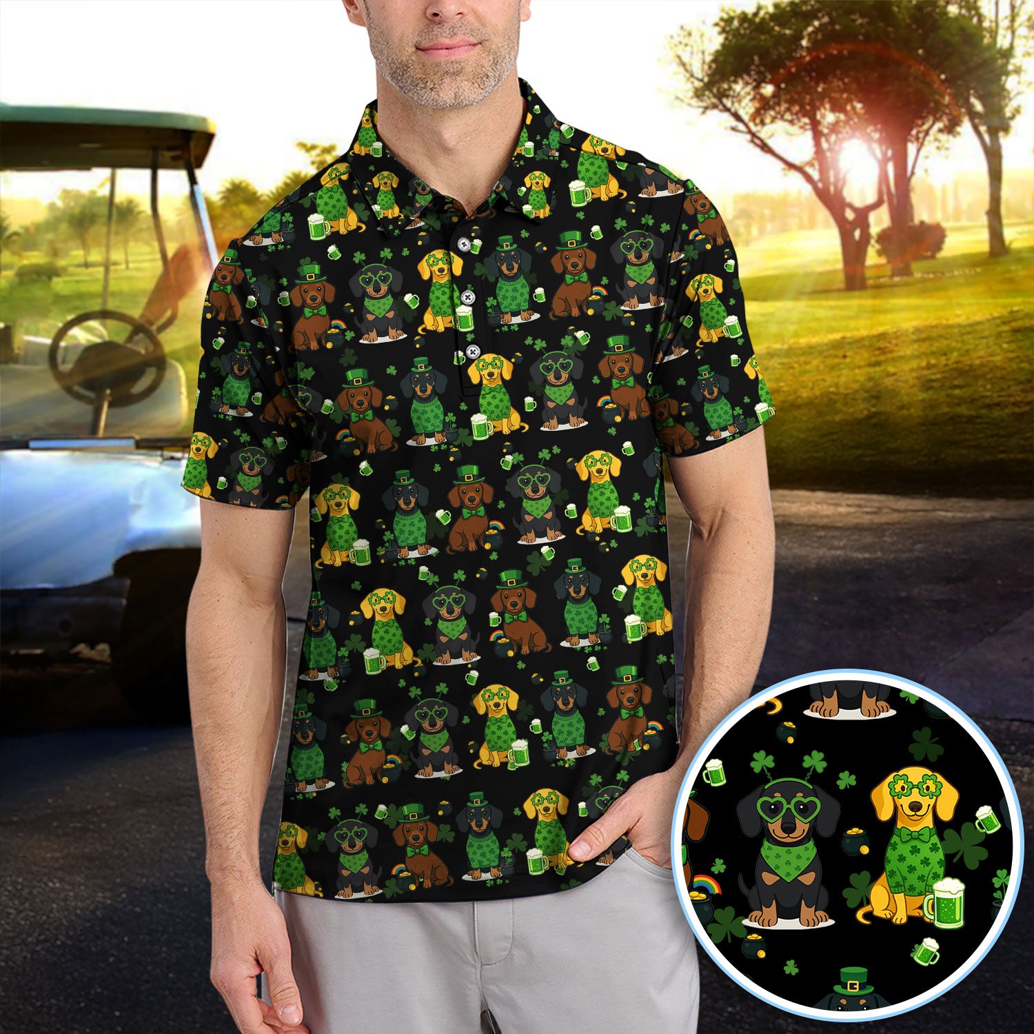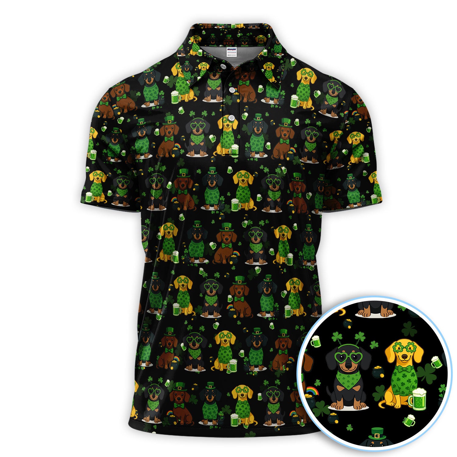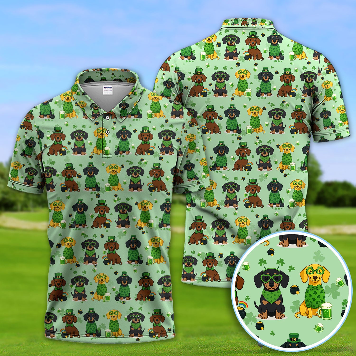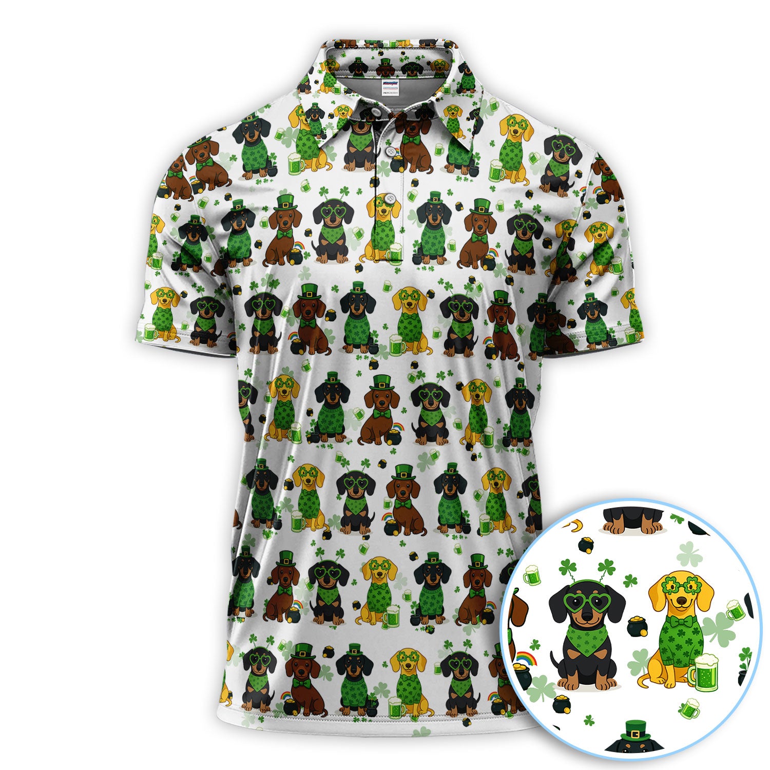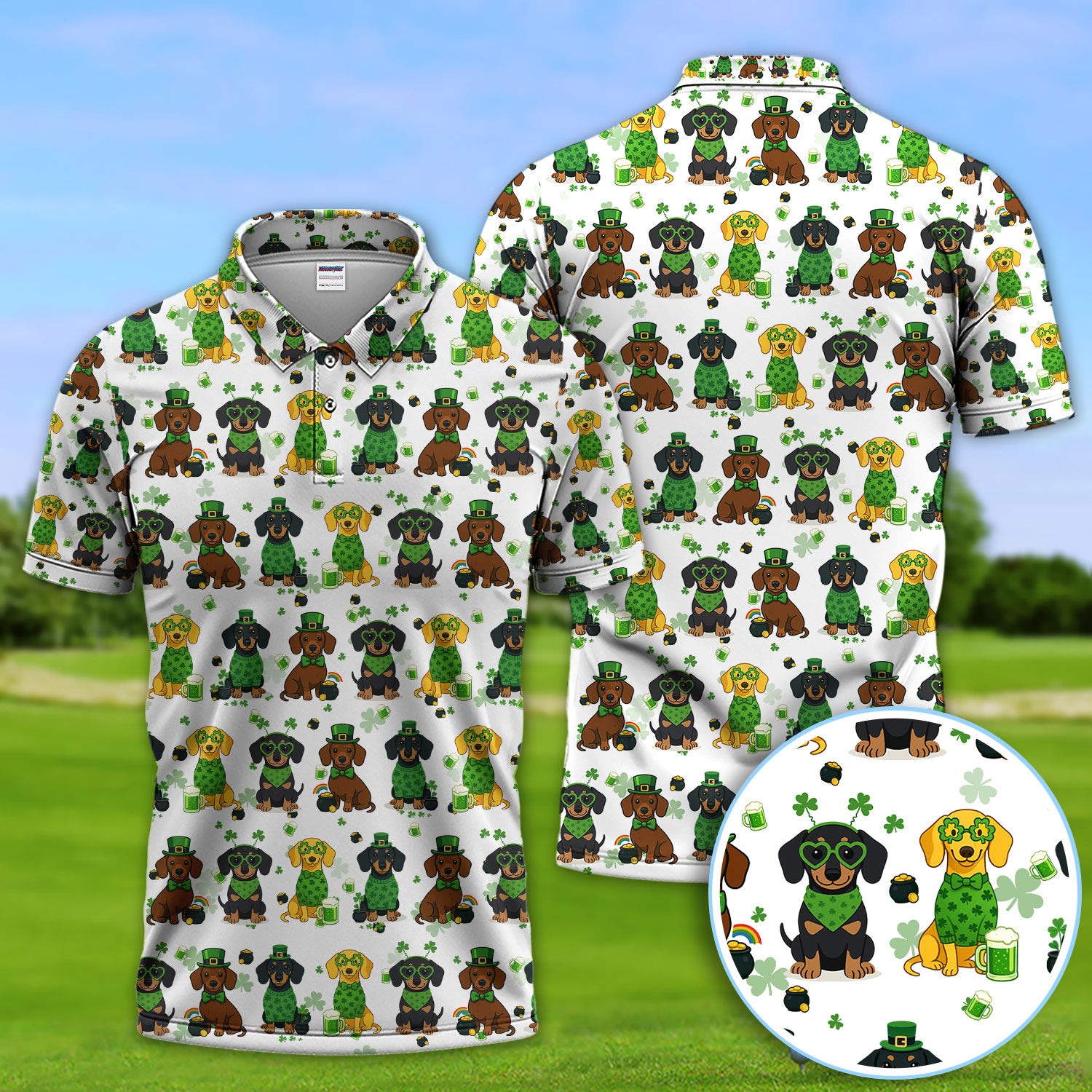St. Patrick’s Day Dachshund Dog Pattern Golf Shirt, Funny Shamrock Dog Golf Polos For Men, Golf Gift For Golfer