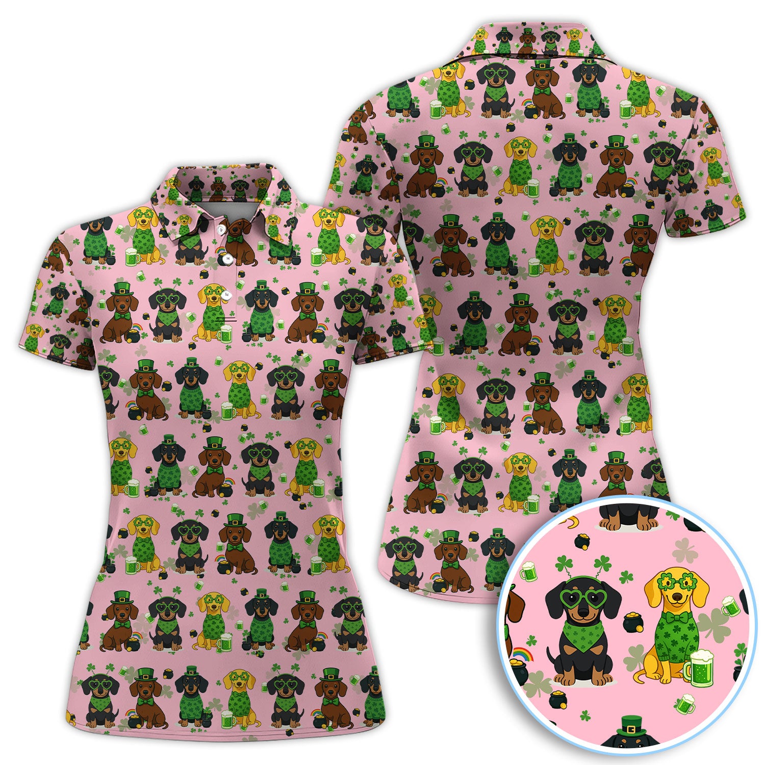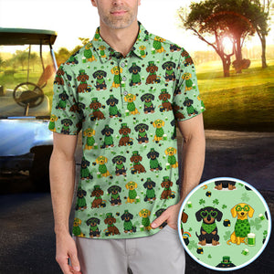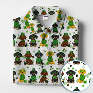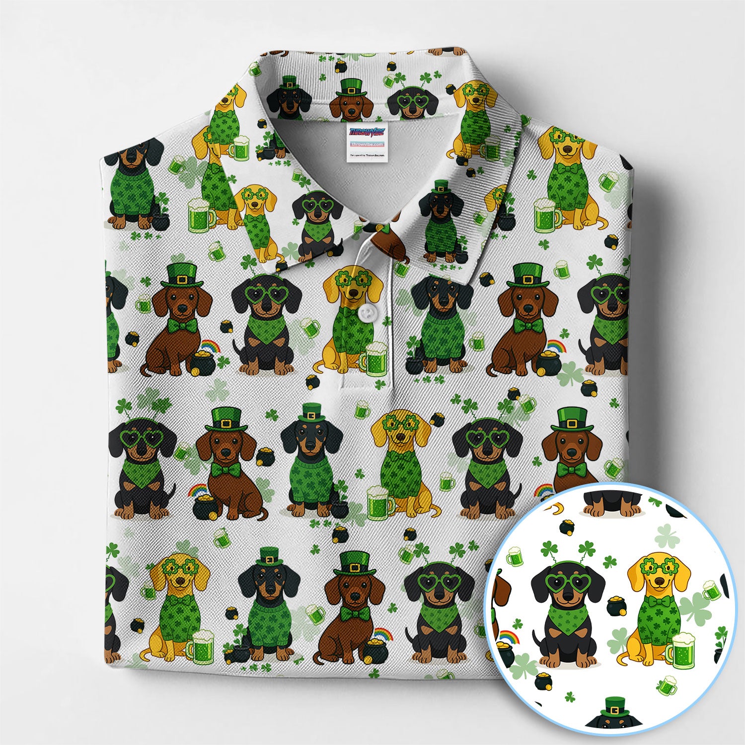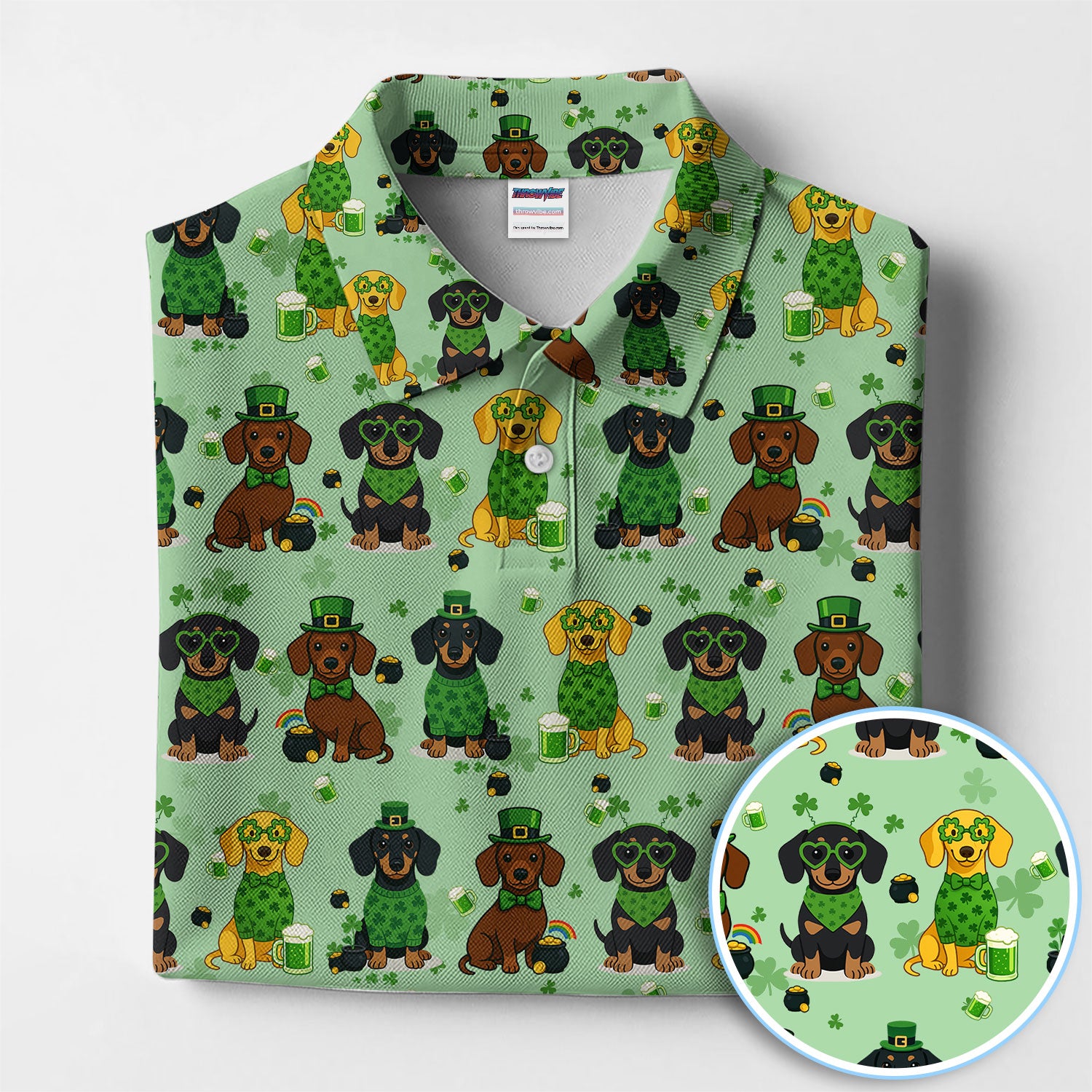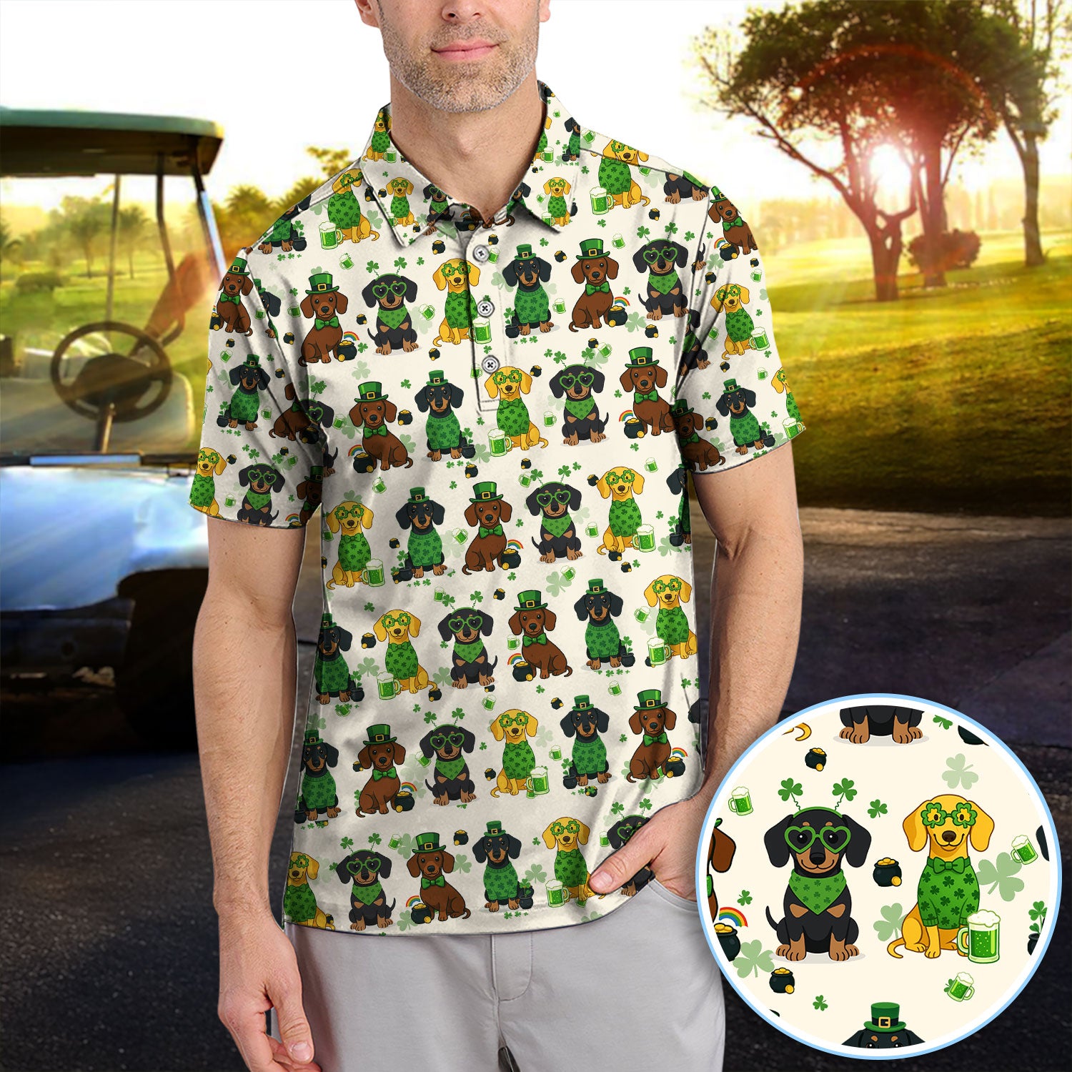 St. Patrick’s Day Dachshund Dog Pattern Golf Shirt, Funny Shamrock Dog Golf Polos For Men, Golf Gift For Golfer