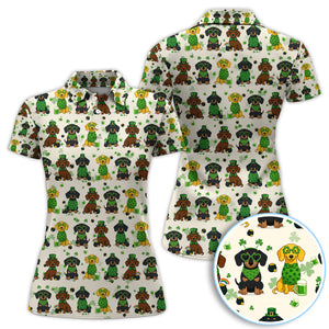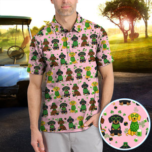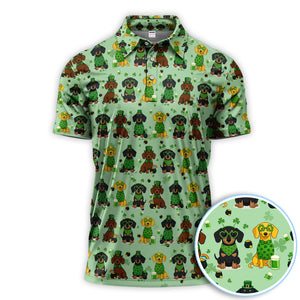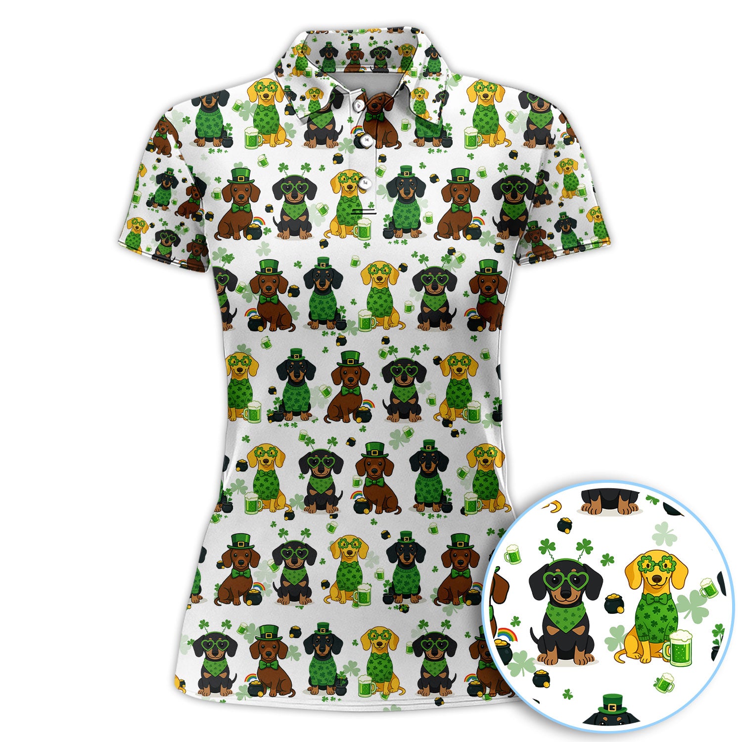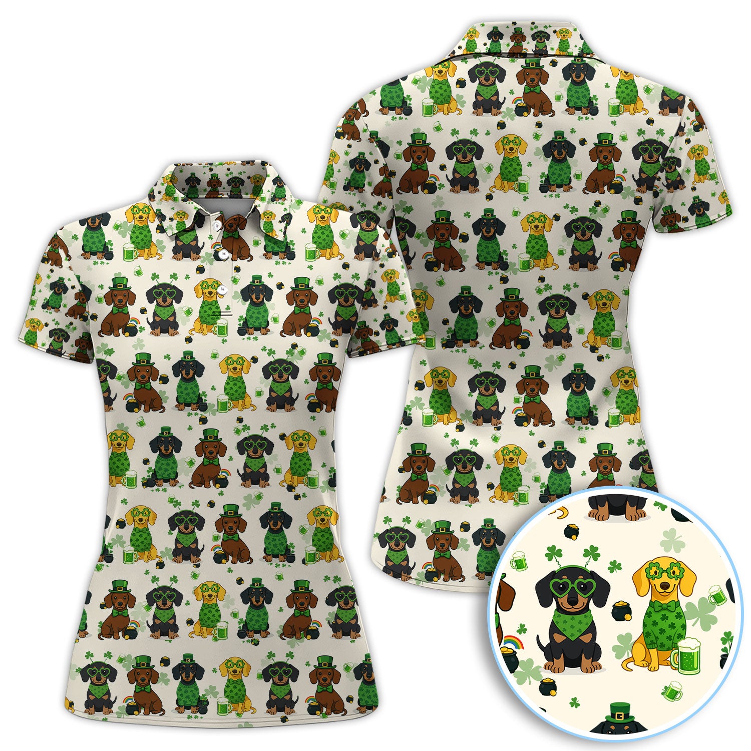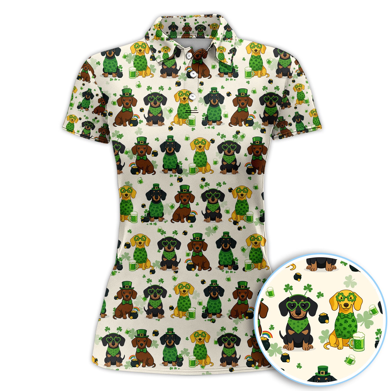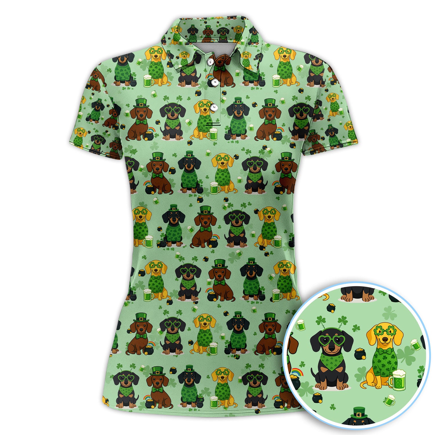 St. Patrick’s Day Dachshund Dog Pattern Golf Shirt, Funny Shamrock Dog Golf Polos For Men, Golf Gift For Golfer