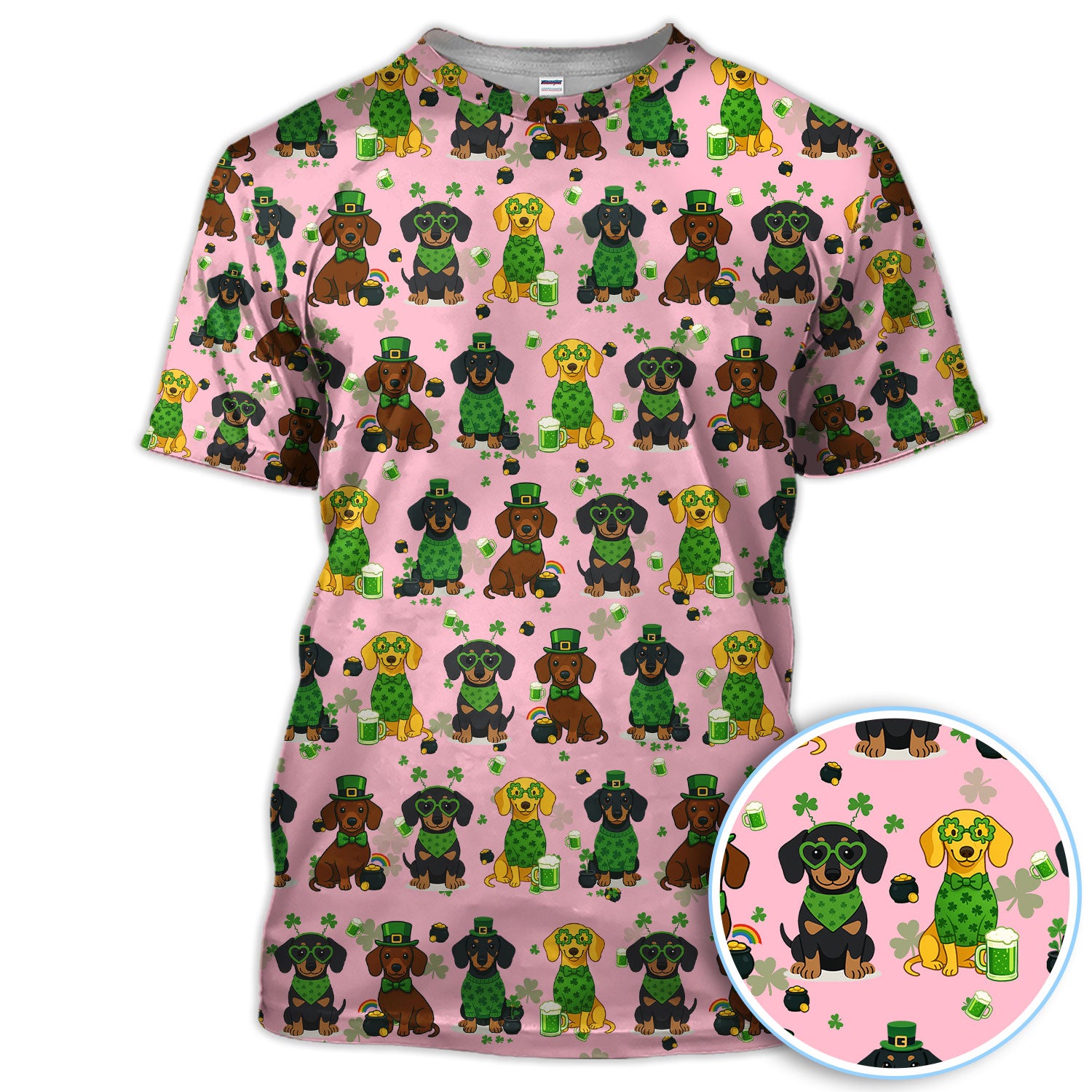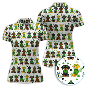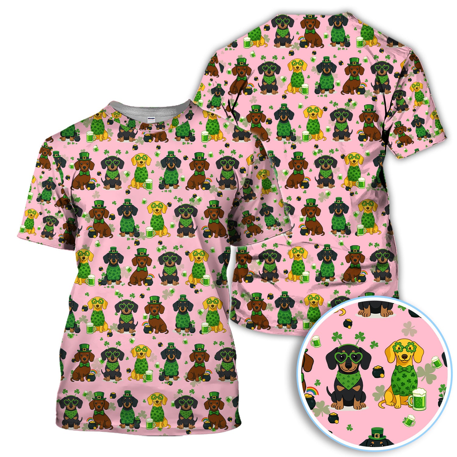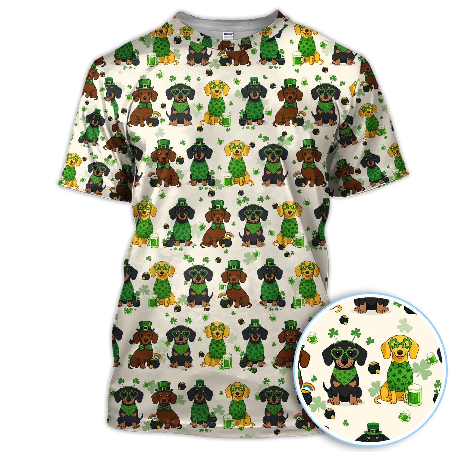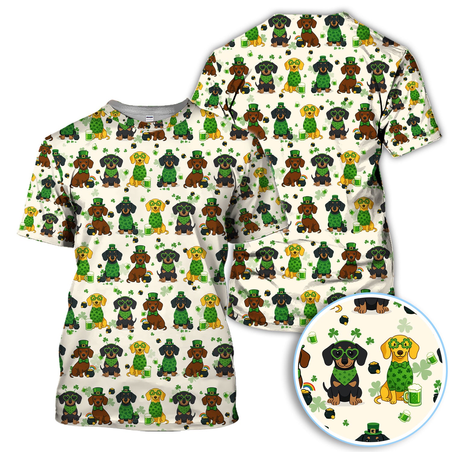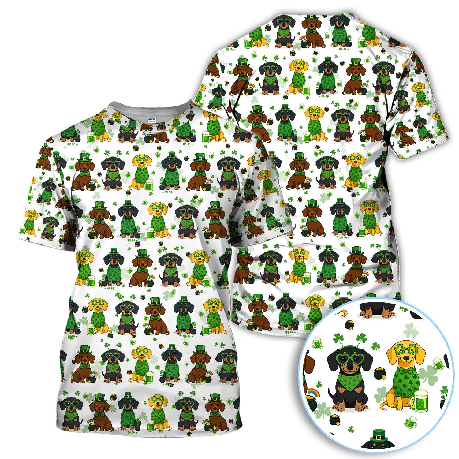 St. Patrick’s Day Dachshund Dog Pattern Golf Shirt, Funny Shamrock Dog Golf Polos For Men, Golf Gift For Golfer