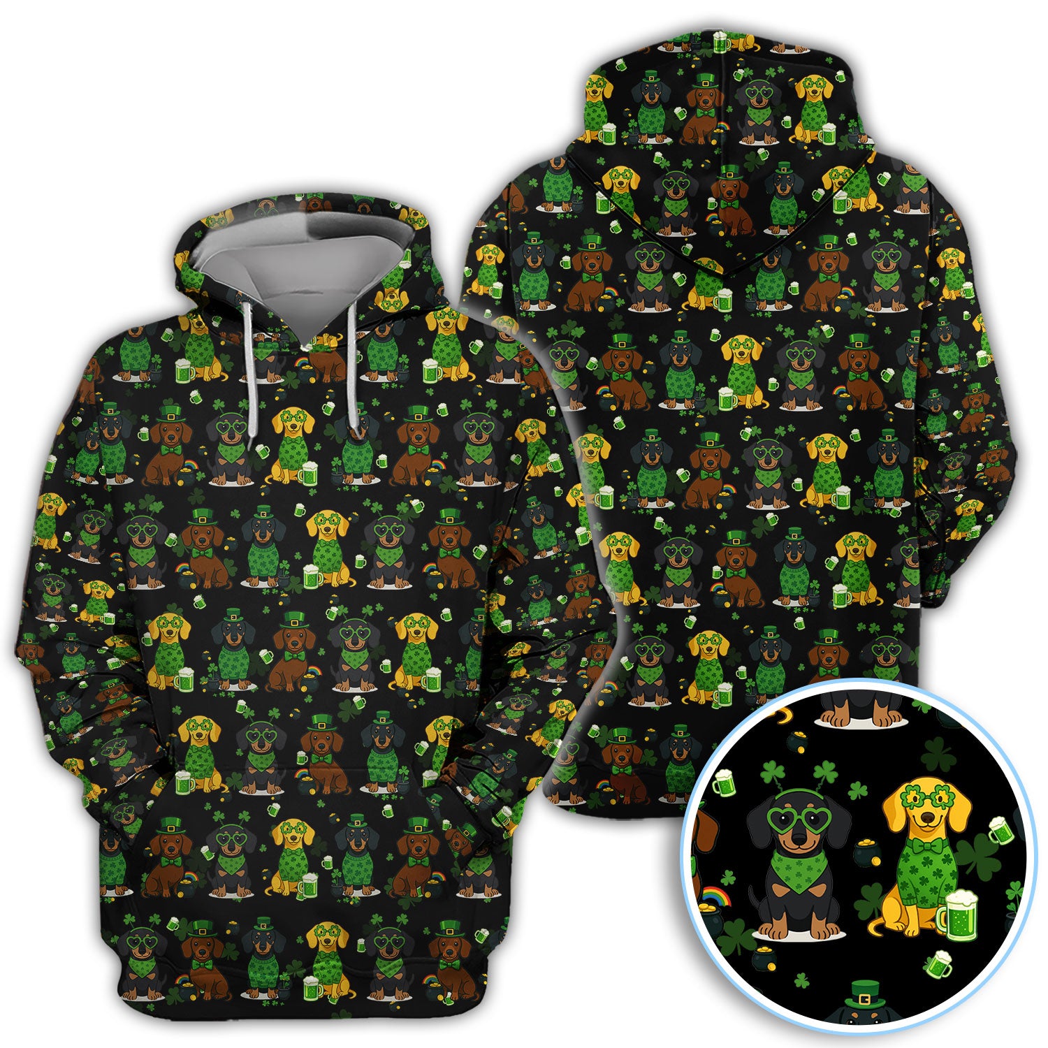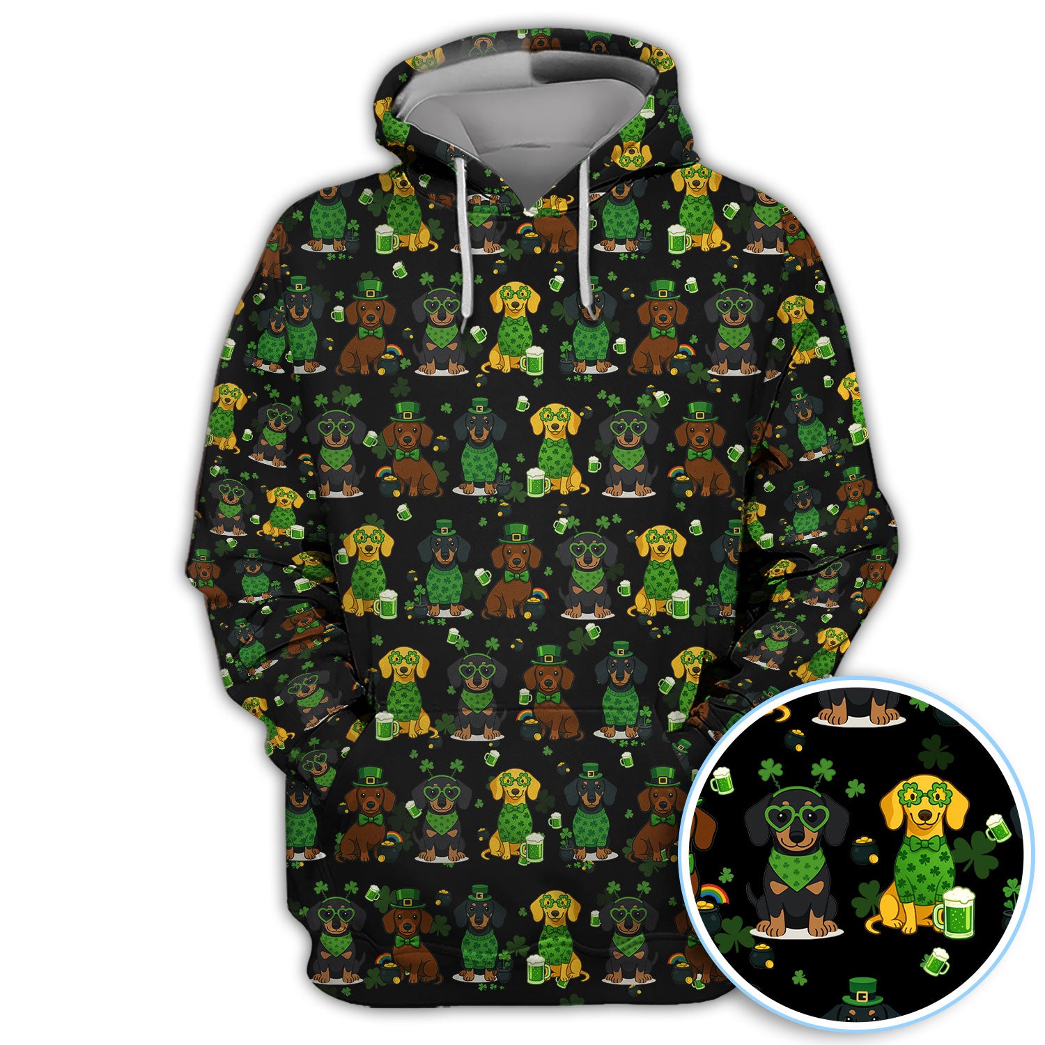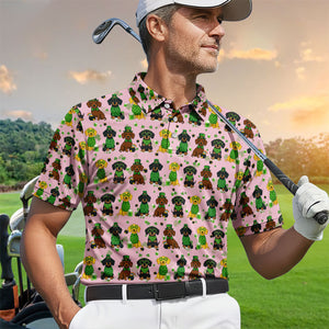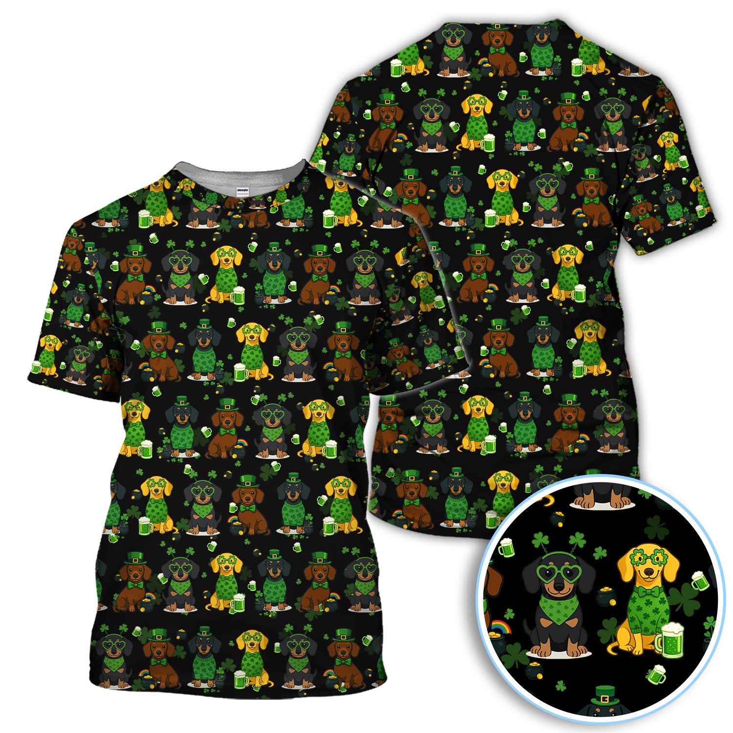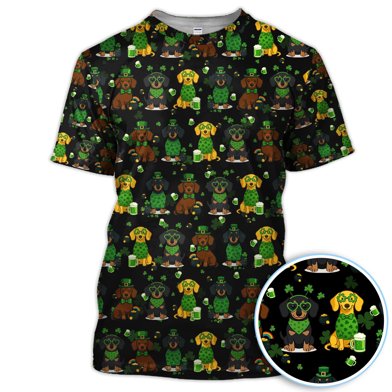 St. Patrick’s Day Dachshund Dog Pattern Golf Shirt, Funny Shamrock Dog Golf Polos For Men, Golf Gift For Golfer