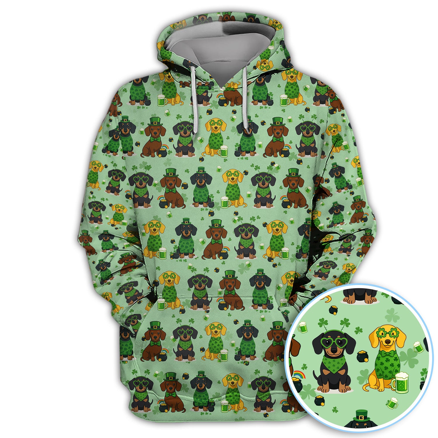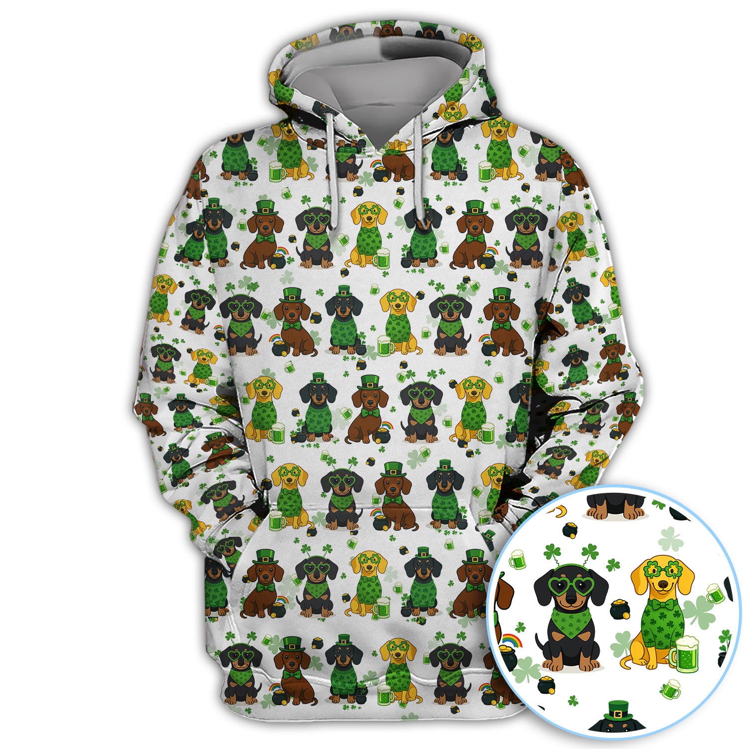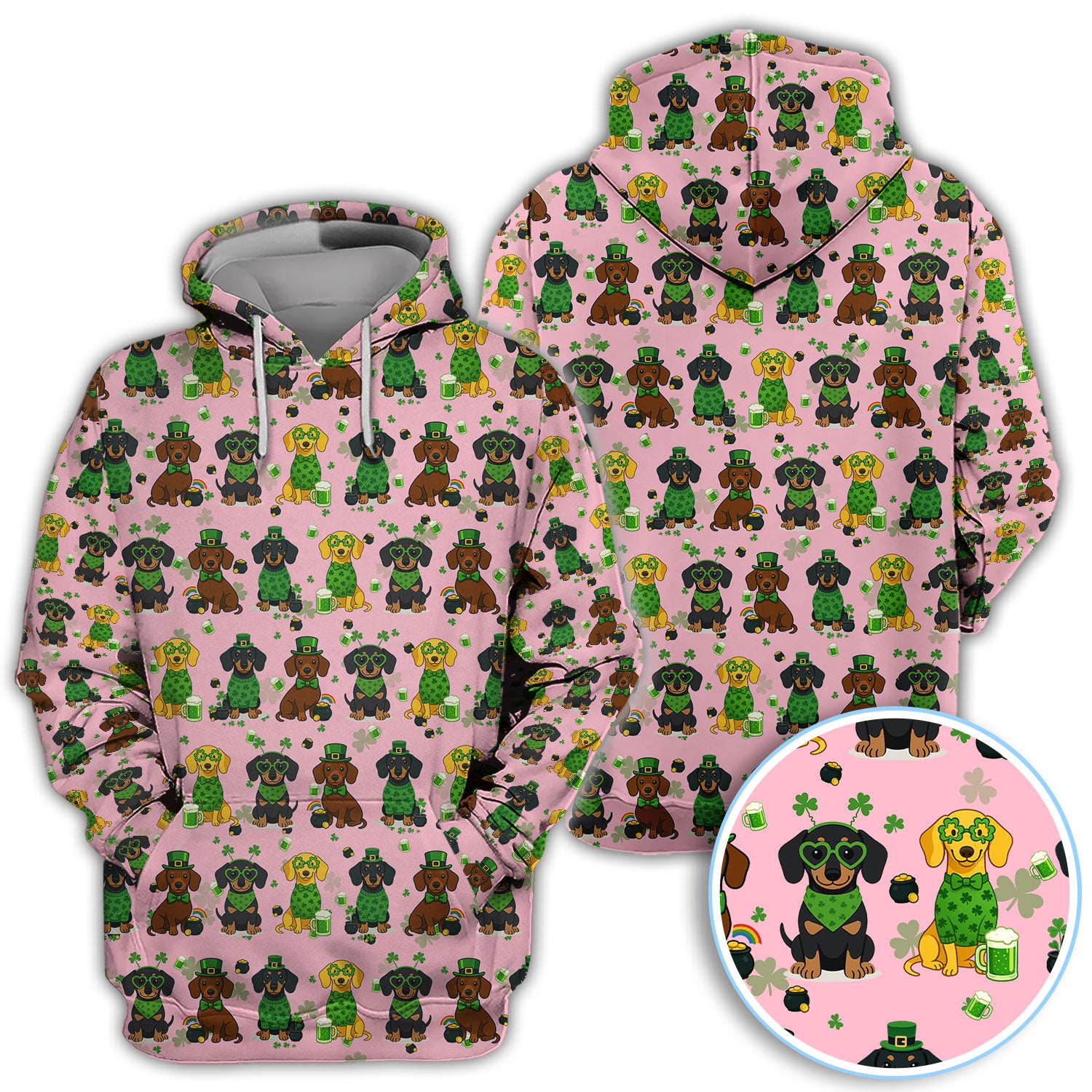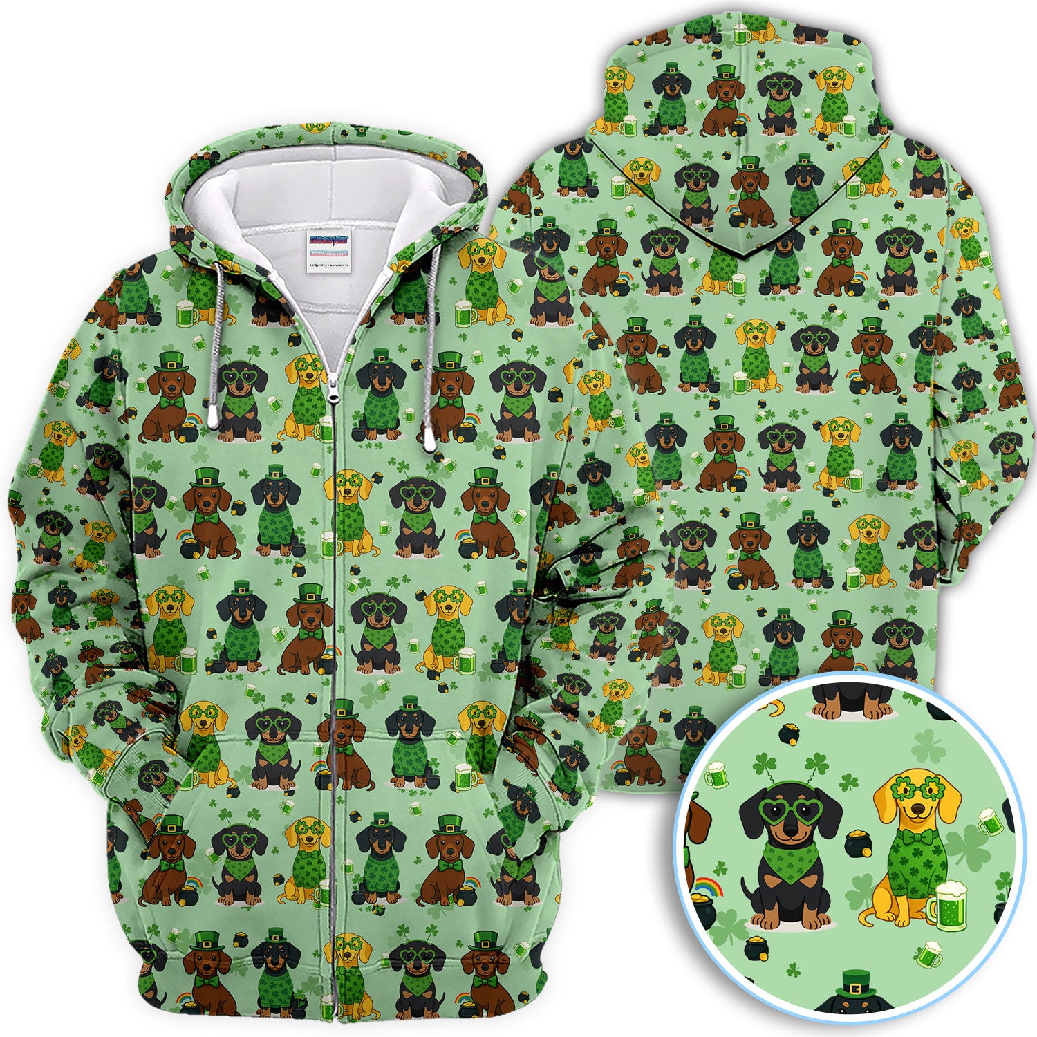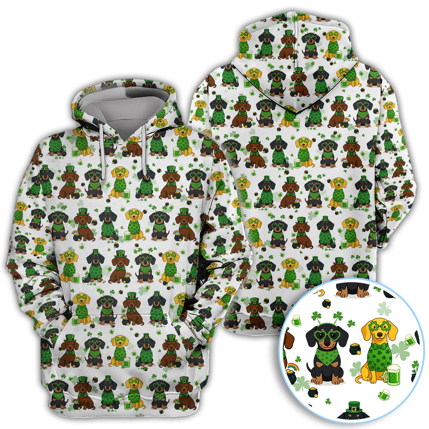St. Patrick’s Day Dachshund Dog Pattern Golf Shirt, Funny Shamrock Dog Golf Polos For Men, Golf Gift For Golfer
