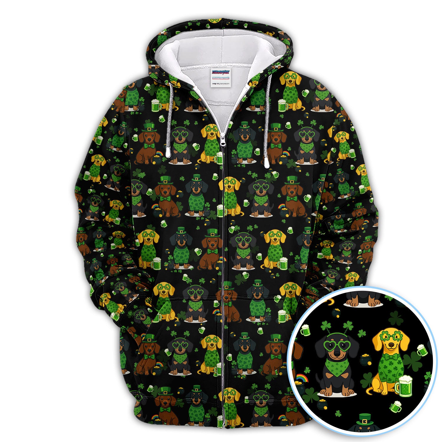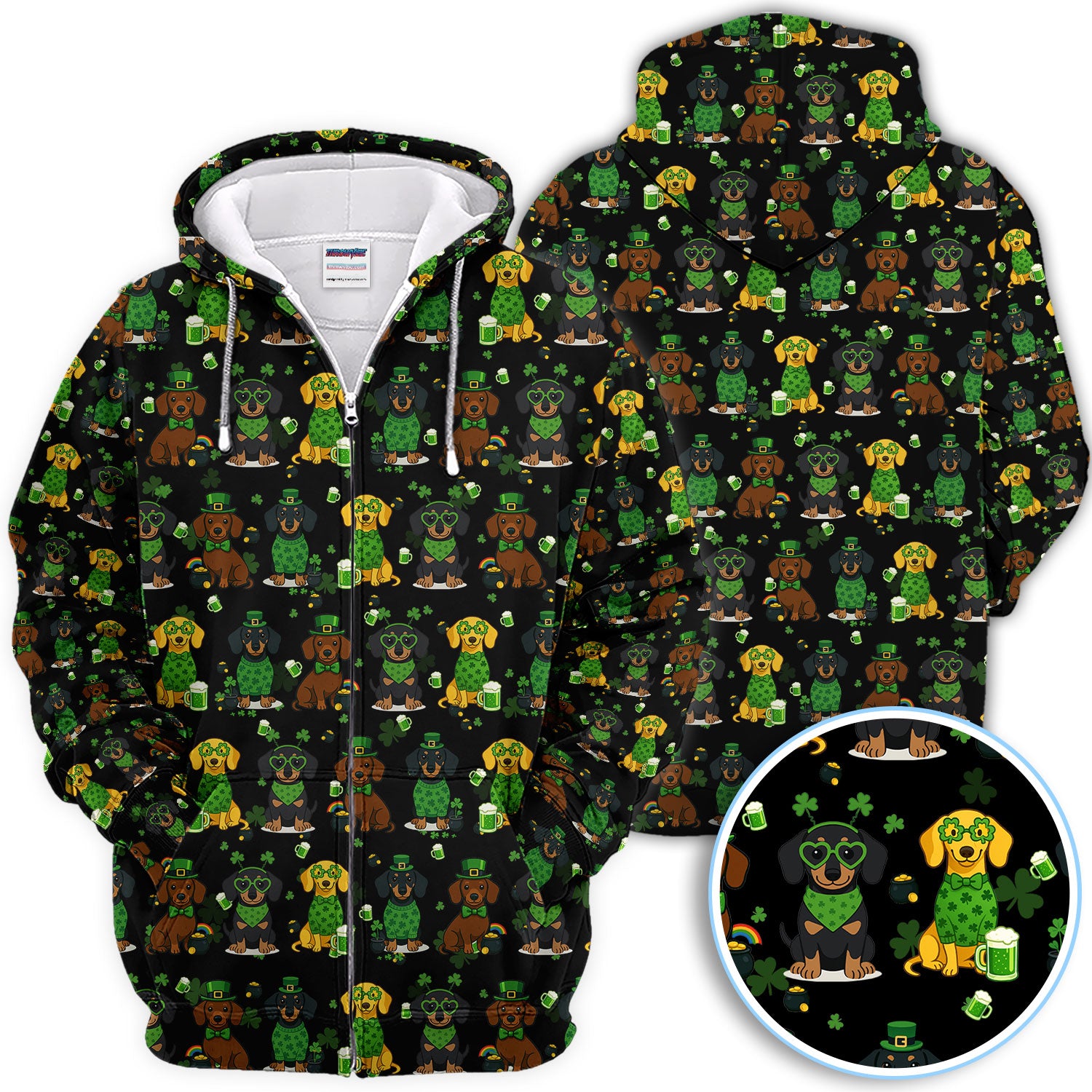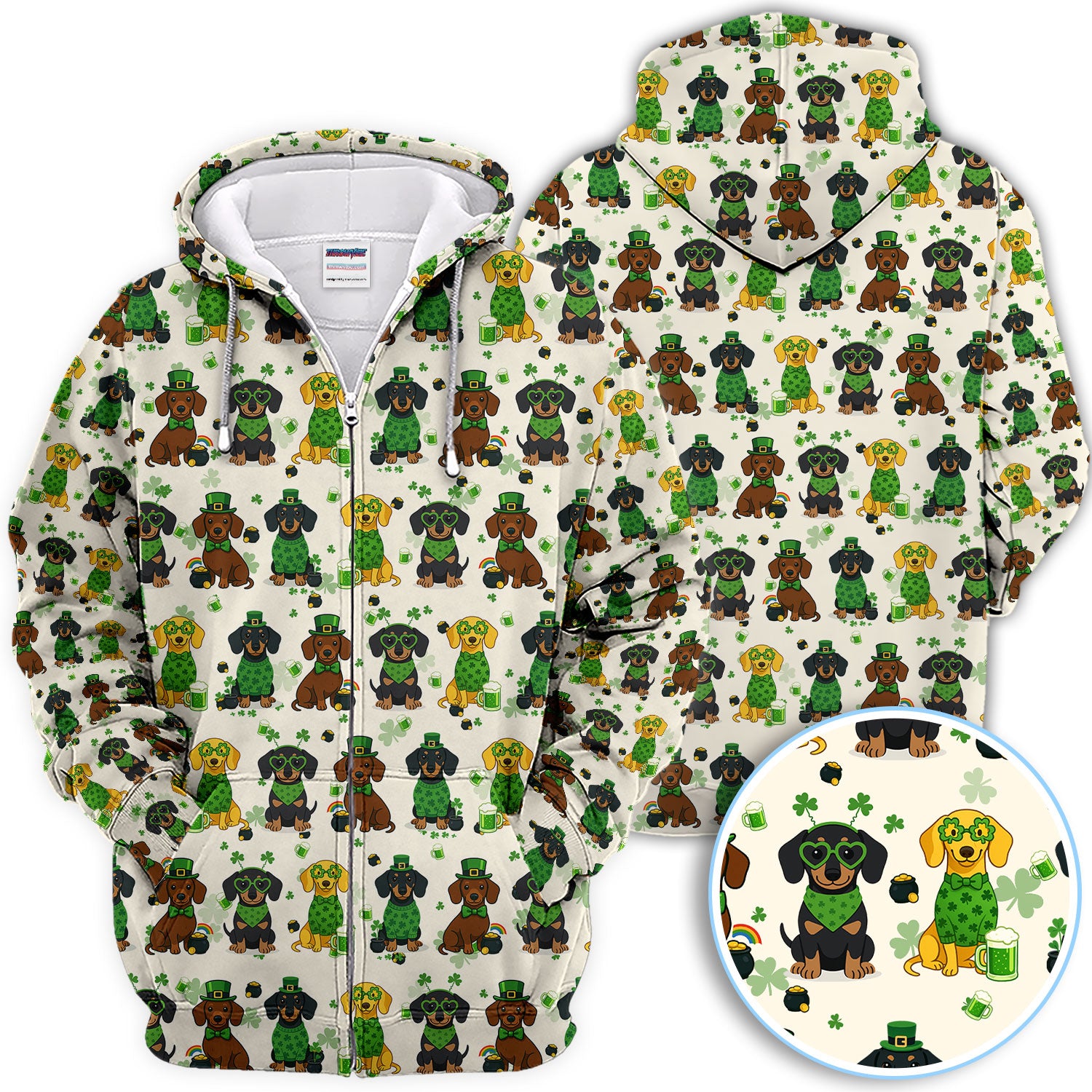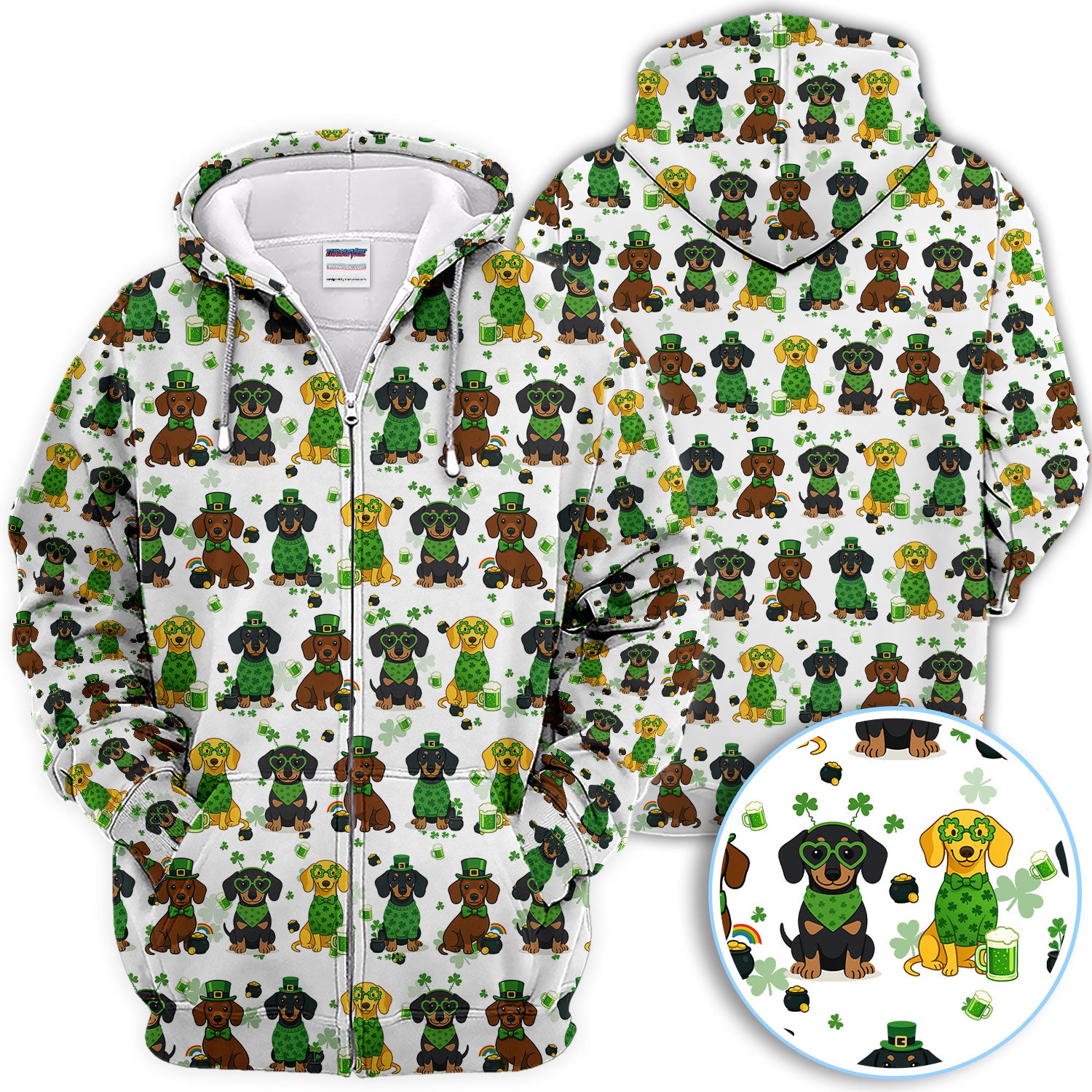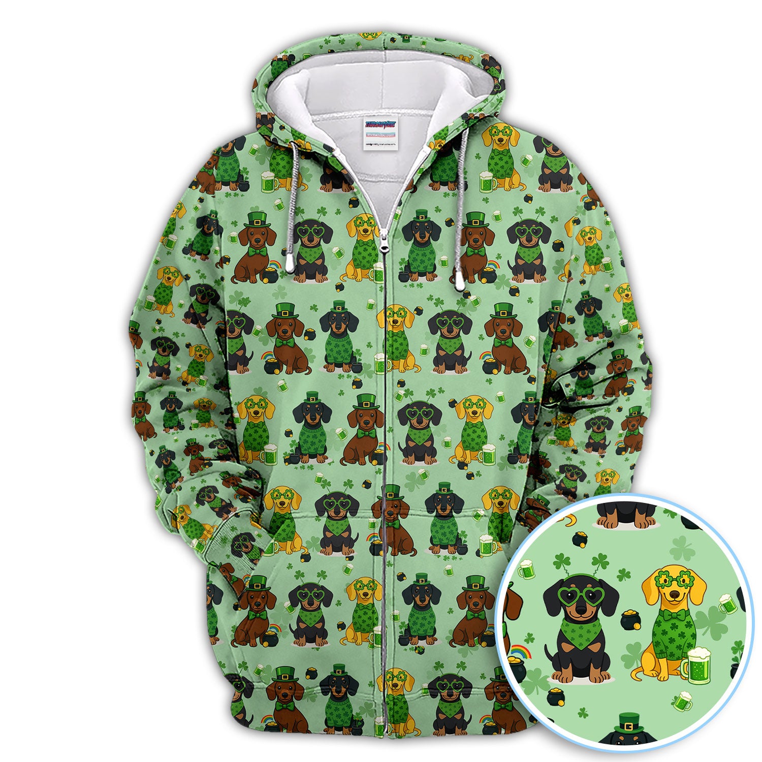 St. Patrick’s Day Dachshund Dog Pattern Golf Shirt, Funny Shamrock Dog Golf Polos For Men, Golf Gift For Golfer