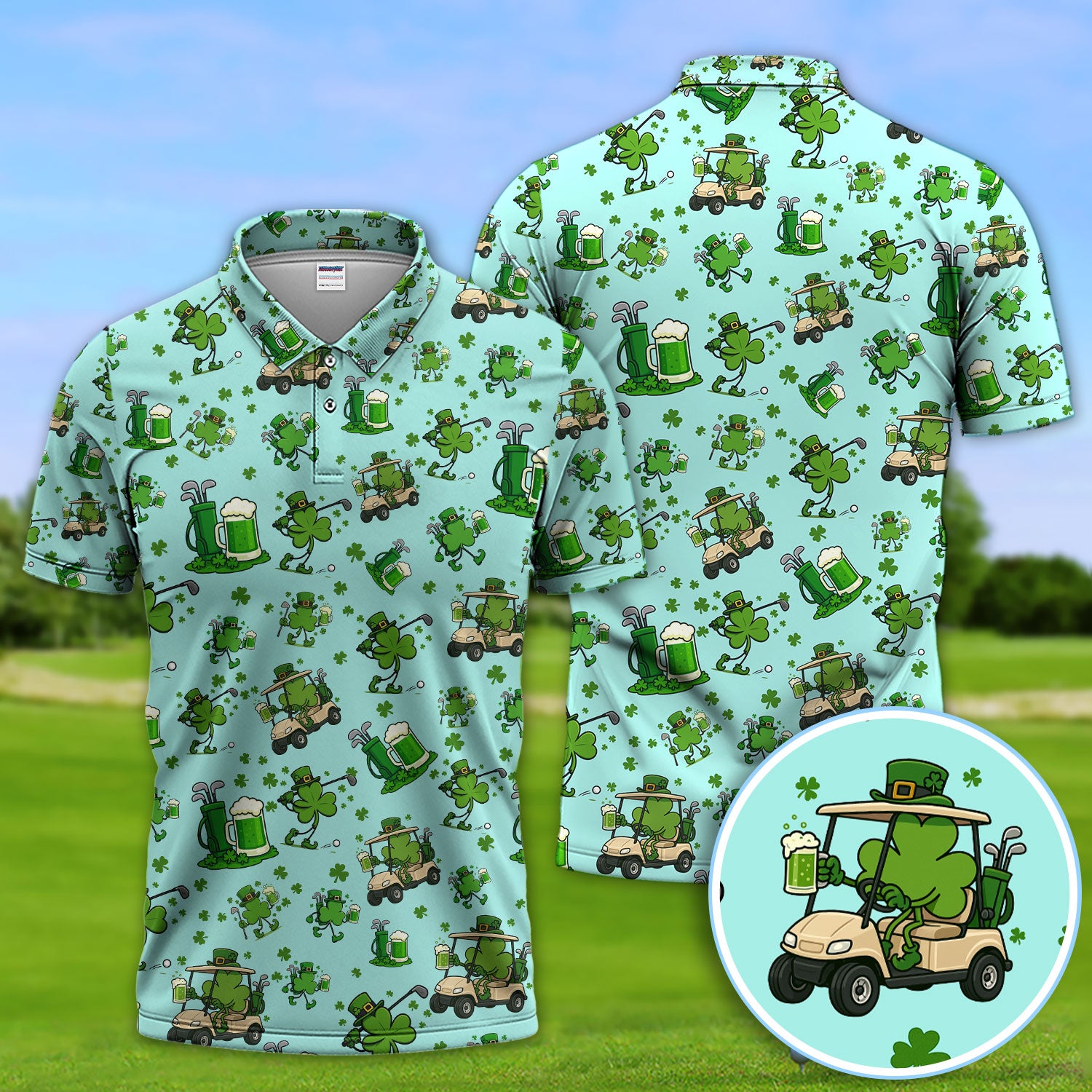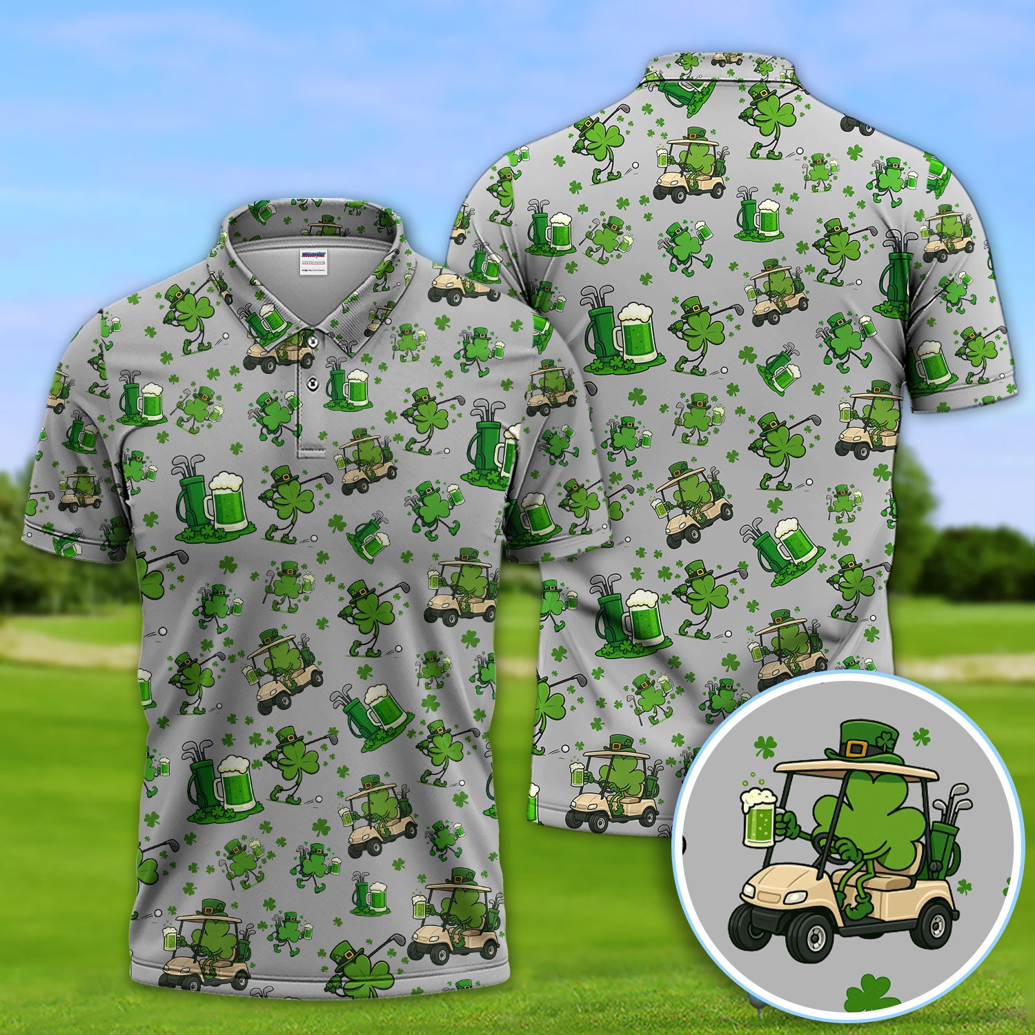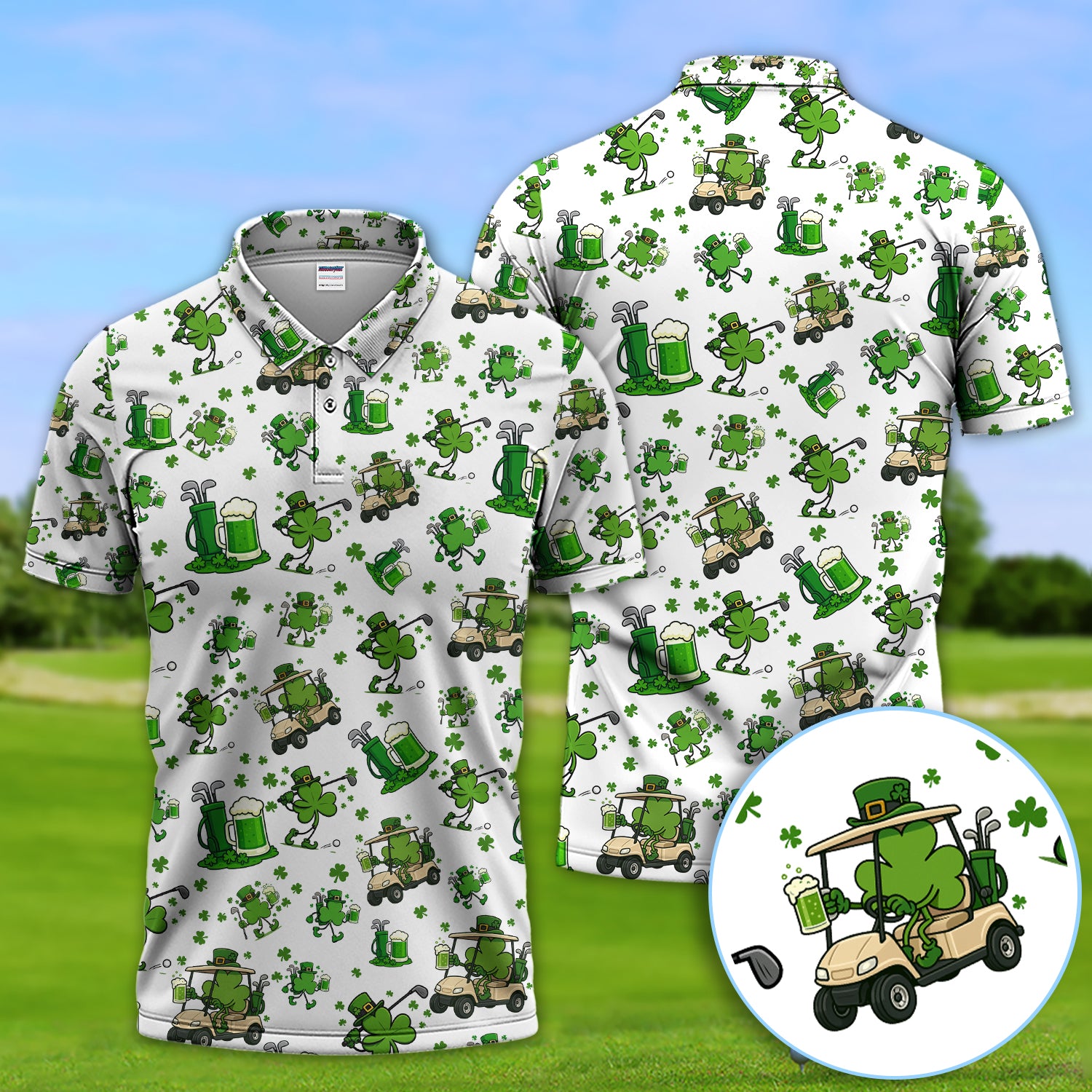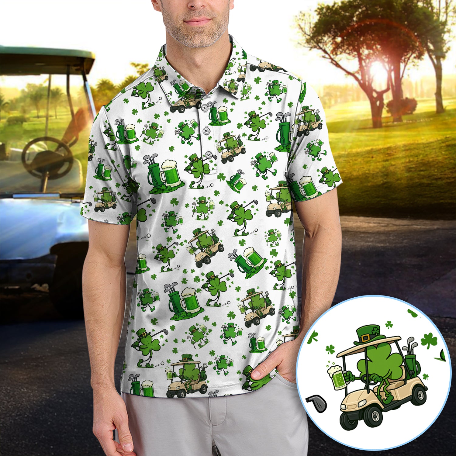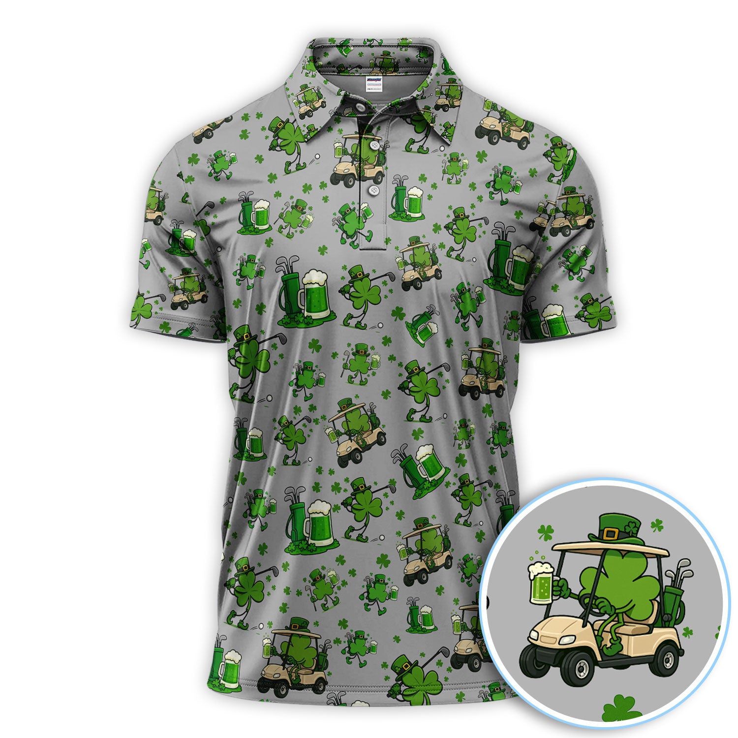 St. Patrick’s Day Pattern Golf Shirt, Funny Irish Golf Cart Polos, Lucky Shamrock Golf Shirt For Men