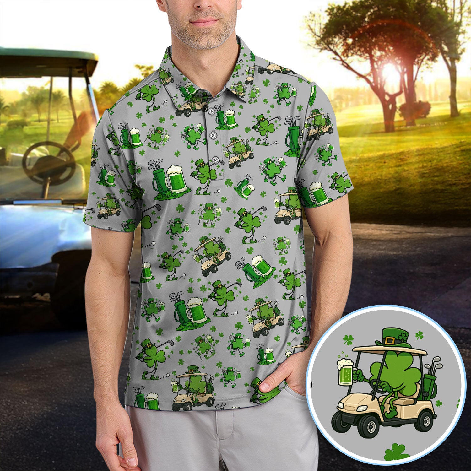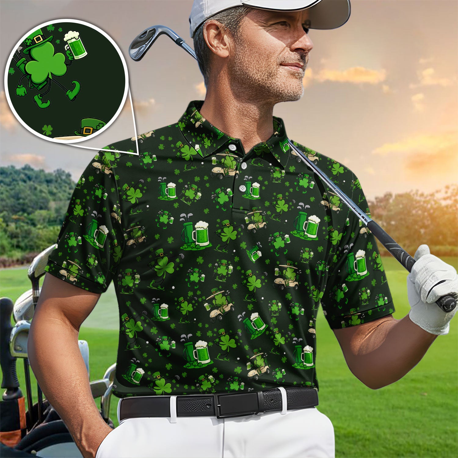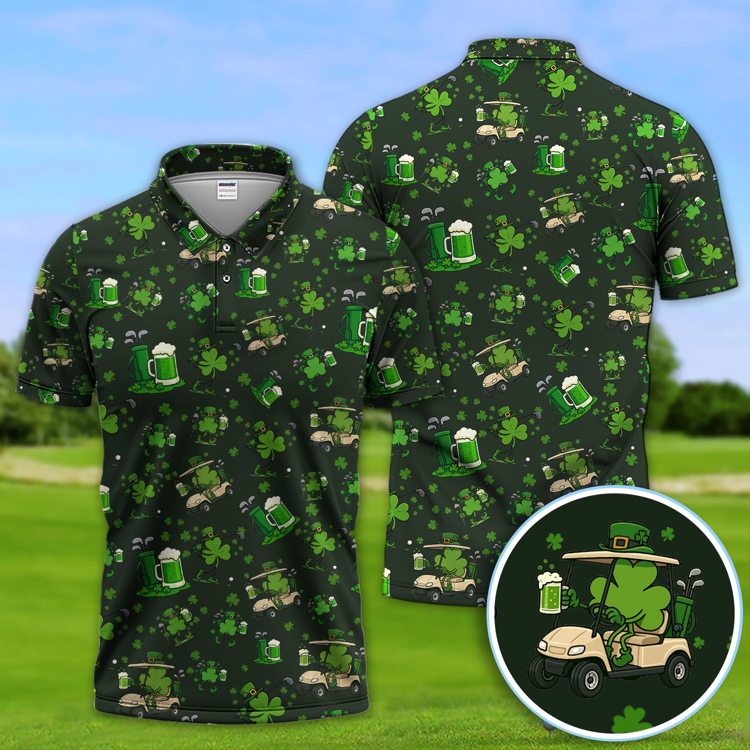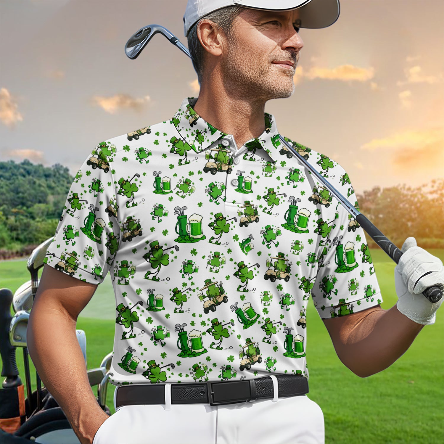 St. Patrick’s Day Pattern Golf Shirt, Funny Irish Golf Cart Polos, Lucky Shamrock Golf Shirt For Men