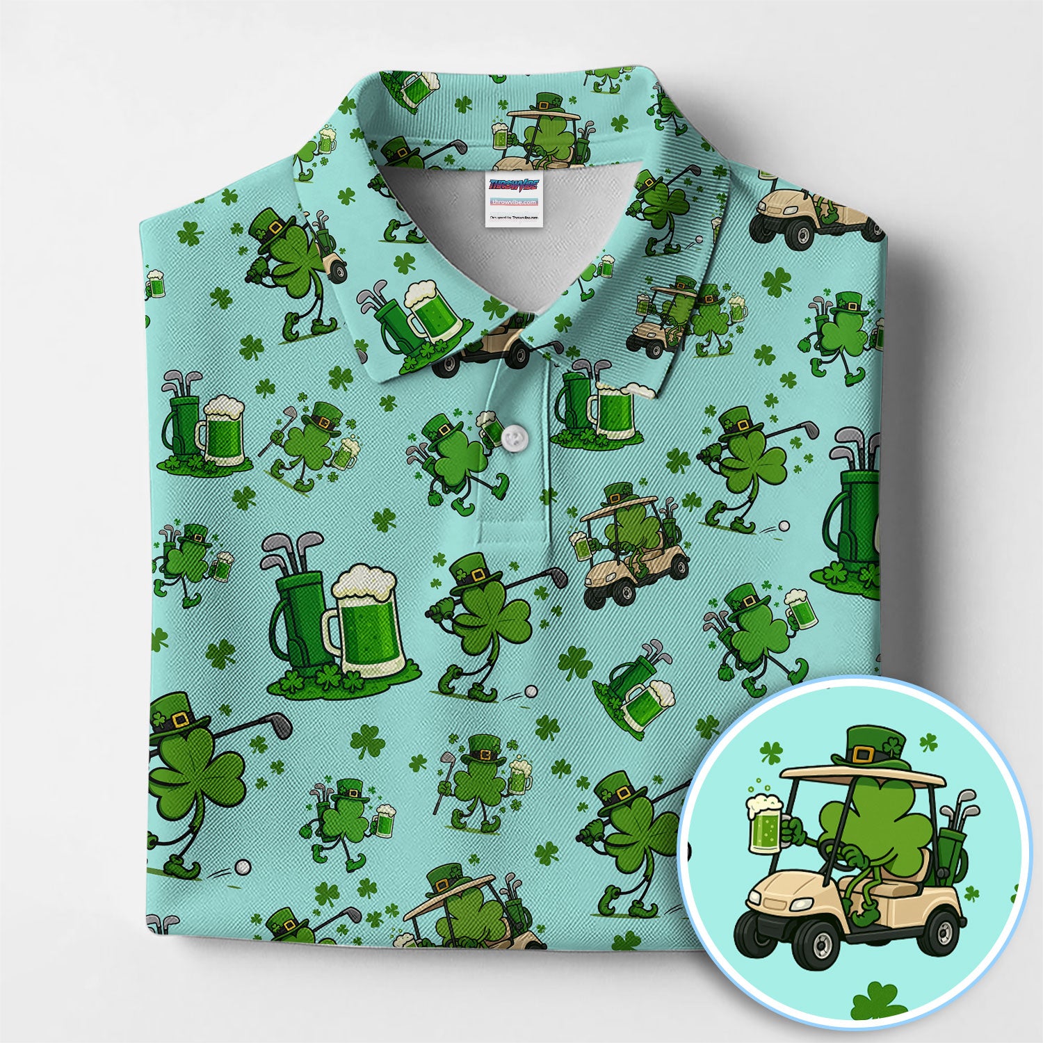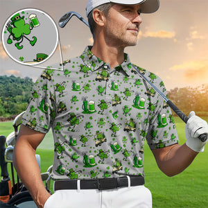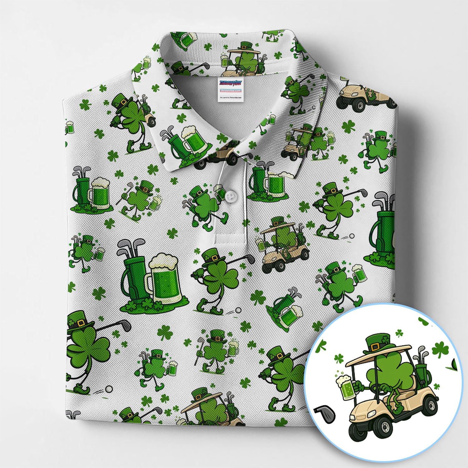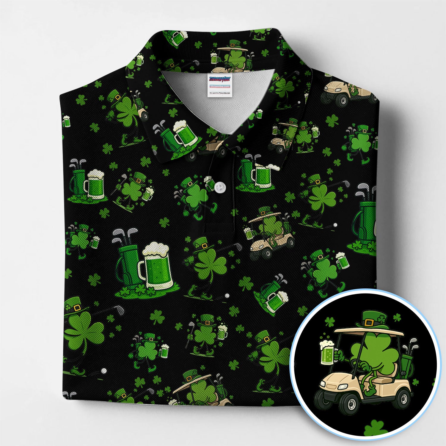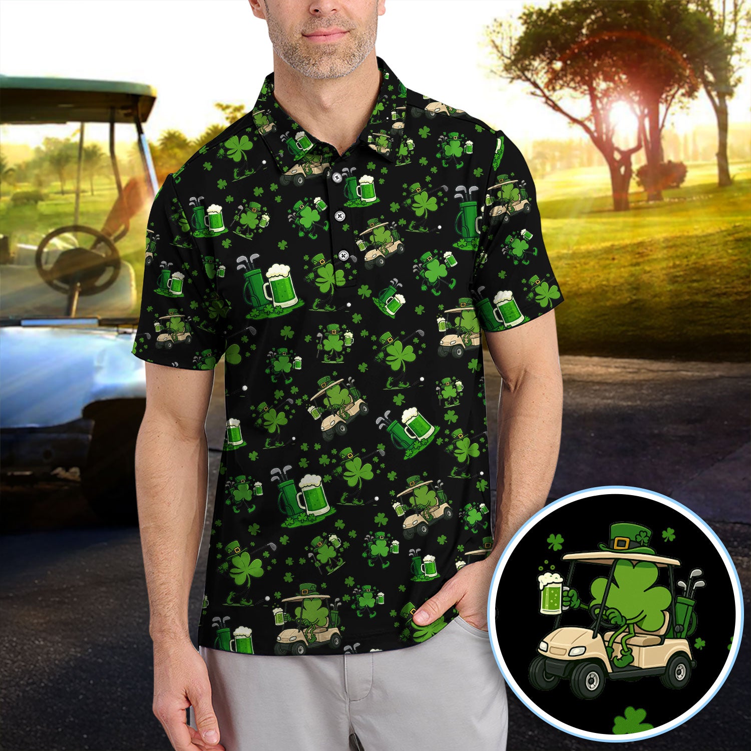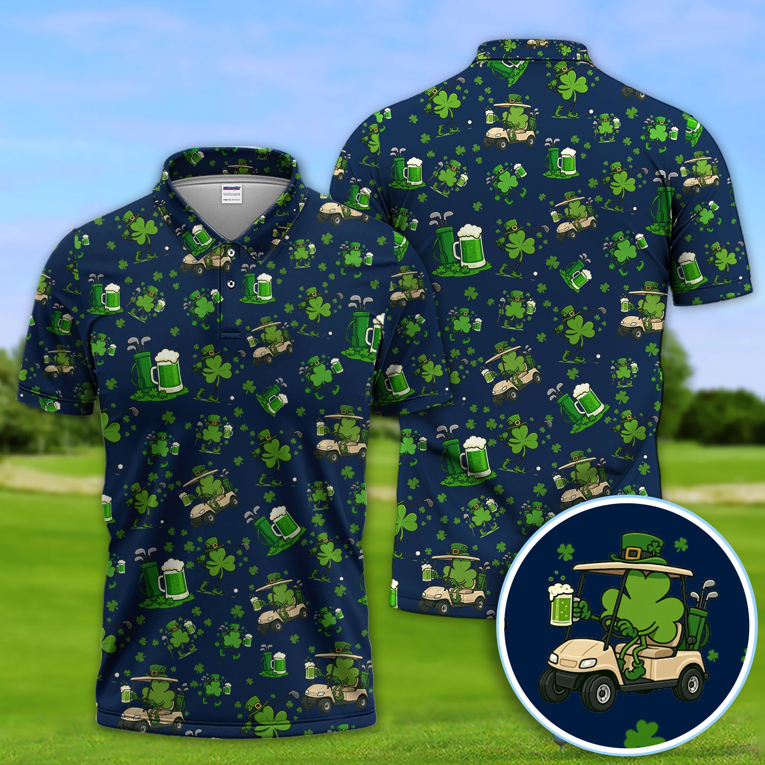 St. Patrick’s Day Pattern Golf Shirt, Funny Irish Golf Cart Polos, Lucky Shamrock Golf Shirt For Men